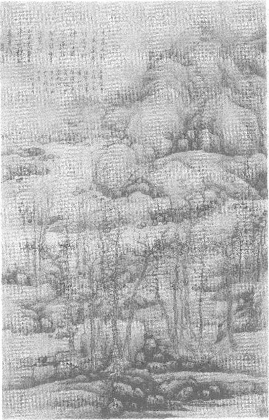 | 释义 | 龚贤木叶丹黄图轴清。龚贤(见《龚贤夏山过雨图轴》条目)绘。纸本墨笔。纵99.7厘米,横65厘米。上海博物馆藏。作者在此件作品中一改苍茫浑郁的风格,用墨以简淡为主。画面上的山峦其势巍巍,雄伟高峻。低处的坡地崎岖坎坷,溪泉曲折于谷地,秋林枝桠曲劲,仅存稀疏的丹黄之叶。两间茅舍半掩于山石之后。作者以干墨层层皴点。墨色层次丰富,光线照射在山林间所形成的阴阳向背的效果,通过留白和皴擦给予得体的表现。近处树干的落笔雄健奔放,构图密而不乱,实中求虚。整个画面意境幽僻,秋意浓郁,令人感到清朗恬淡,并无凄凉哀婉的气氛,充分表现了作者热爱自然,融于自然,并以脱俗超世的心境去观察和表现景物季节变化的本愿。图左上方有自题七言诗一首。款署:“乙丑霜寒日,半亩龚贤画亦题。”乙丑为康熙二十四年(公元1685年)。此画堪称龚贤的杰出代表作。