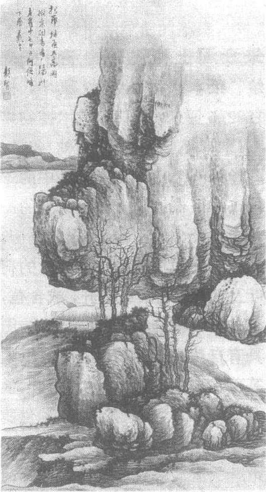 | 释义 | 龚贤高冈茅屋图轴清。龚贤(见《龚贤夏山过雨图轴》条目)绘。绢本墨笔。纵98厘米,横55.8厘米。天津市艺术博物馆藏。画面的主要位置绘一巉峻的巨形悬崖,下临平静开阔的水面,彼岸山岭逶迤,近处丘陵山石起伏,枯树疏疏落落,高冈之上有两间秀丽简洁的茅屋。构图章法严谨有序,笔触娴熟,皴染浑厚,墨韵粲然、苍润。画面以近景为主,适当照顾远处的景色。如镜的水面、萧瑟的枯枝,凝聚的雾霭,使观者仿佛置身于秋冬之际夕阳斜照的寂寞世界中,由此感觉到清凉空气拂面,领略到无穷意味。有人评价此图的效果似近代炭笔画风格。