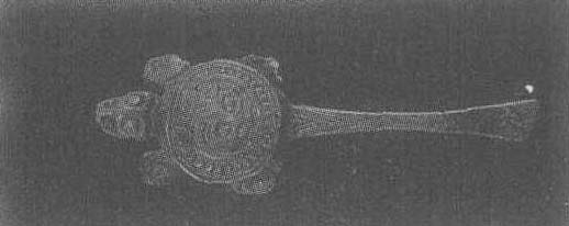 | 释义 | 龟形骨刻刀商。通长7.8厘米,刃宽0.8厘米。1976年于河南省安阳小屯殷墟妇好墓出土。柄端刻一龟,头向前伸着,微仰,张口瞪眼,四足外撇,做爬行状。龟背刻巨目、宽鼻的团身蟠龙,体饰点状纹,龟腹微内凹,上浅刻圆涡纹,颌有一与口相通的小孔,可能为饰佩带用。刀身与龟尾相吻处,刻重叠的“V”形纹数道。此龟形刀,雕刻精致,别具情趣。