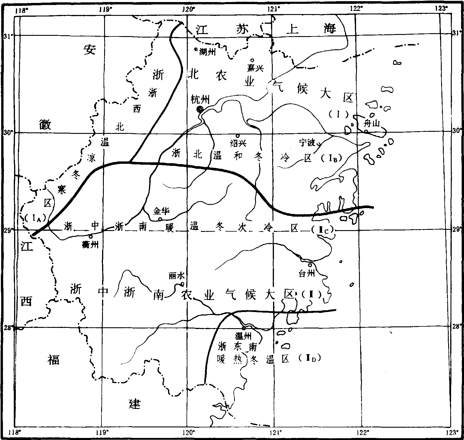 图 1-2-4 浙江省热量分区图 多,使与这共生的立体气候变得多种多样,浙西北北坡的安吉县迎风向阴,冬季成为冷区;南坡的临安县背风向阳,寒冬常较温暖;金衢盆地夏暑冬冷,沿海丘陵、海岛和新安江丘陵区冬暖夏凉; 内陆衢州夏秋高温干旱,而同纬度沿海的临海、三门是夏秋湿润多雨,等等。地貌类型、立体气候的多样化,使农业生产有着多宜性,农业布局可有较多的选择。3. 季风气候的不稳定性和农业气象灾害的多发性。浙江省常年气候是四季分明,热量较优,雨量丰富,光照相宜,水热基本同季,对农林牧业发展,提供了良好的生态环境。但因季风气候的不稳定,使季际、年际之间气候差异悬殊。如春夏梅涝而夏秋干旱,高温酷暑而寒冬冻害,加以台风、冰雹的侵入,使山区气象灾害频频显现,使有利的气候资源,难以充分合理的利用。年际之间的波动,则又加剧了它的严重程度。比如,多雨年降水常为少雨年降水的二三倍,常使山区山洪暴发;而少雨年,常常夏秋连旱,特别是内陆降水“单峰型”地区,成为“大火炉”。从各种灾害的出现机率看,频率颇高:倒春寒浙北3年1遇;春秋低温连阴雨(5天以上低温寡照天气)每年平均6—9次; 夏秋干旱3年1遇;登陆台风平均2年1次,强台风影响平均每年1.4次,等等,都对稻作、茶、桑、果和经济作物带来不同程度的危害。 |