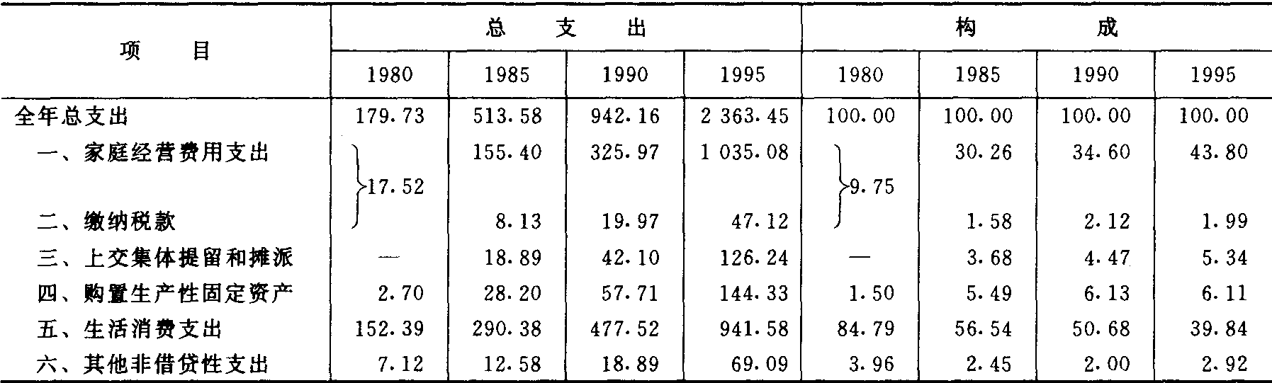 | 释义 | (一)农户支出及其特点农村改革以前,新疆农户全年支出中,大部分甚至绝大部分为生活消费支出。合作化时期生活消费支出占到60%~70%,公社化时期达到80%~90%。1980年以来,农村推行联产承包责任制,农民家庭购置生产性固定资产支出和家庭经营费用逐年增加,所占比重也逐步增长,而生活消费支出在总量上虽然不断增加,但所占比重则逐步缩小,支出结构发生明显变化。见表10-3-4。 表10-3-4 1980年以来农民家庭支出及构成变化