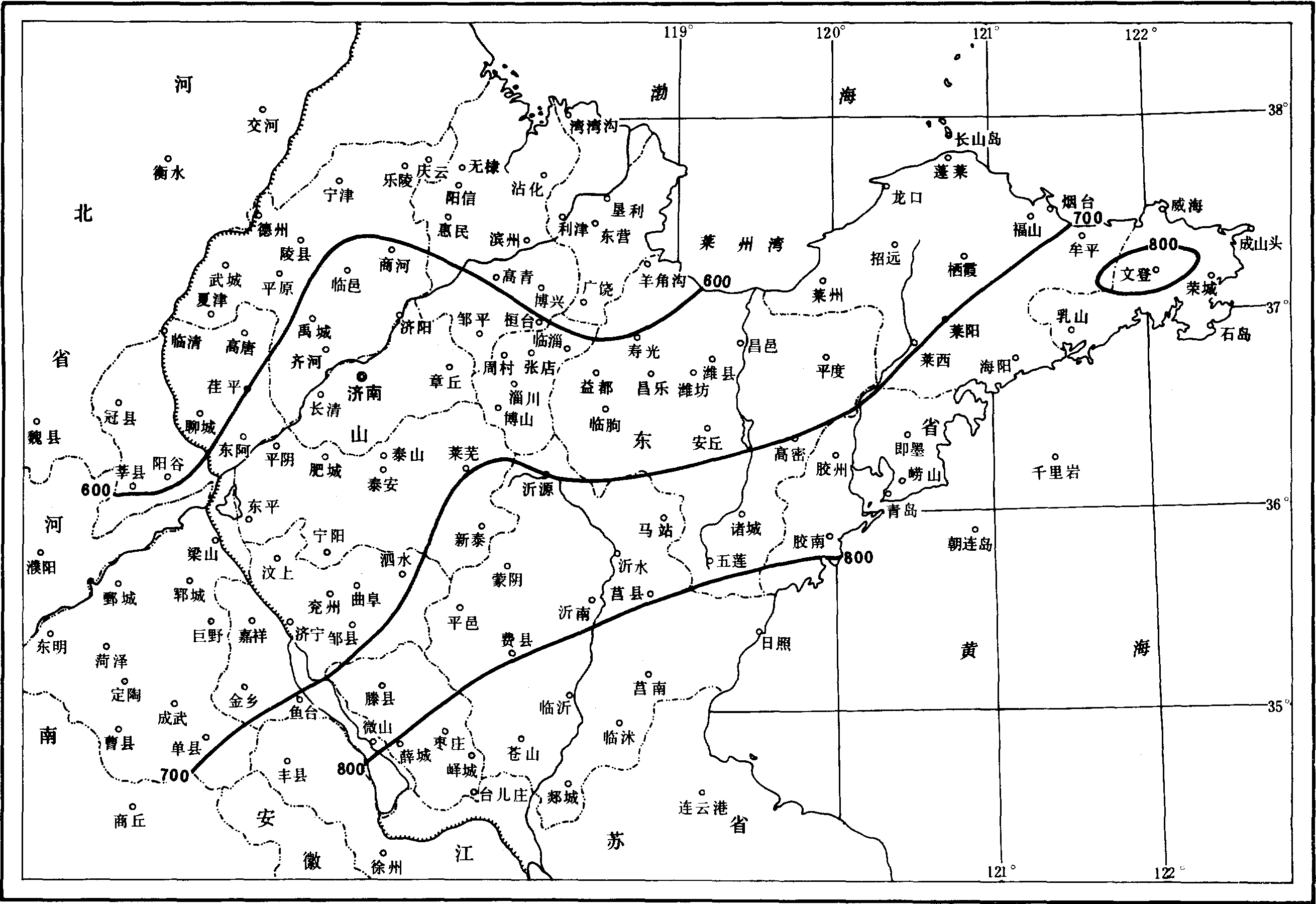按照年降水量的多少,全省可划分为3个雨区:鲁中山区南侧、鲁东南沿海及半岛南部为多雨区,年降水量在700毫米以上。其中枣庄、临沂、郯城、日照一带降水最多,在800毫米以上;半岛北部、鲁中山区、鲁西平原为中等雨量区,年降水量600—700毫米;鲁北、鲁西北平原为少雨区,年降水量在600毫米以下。 2. 降水量的季节分布。分别为: 春季,全省降水较冬季有显著增加,季降水量为70—130毫米,一般在100毫米左右,占年降水总量的12%—18%。鲁南、胶东半岛东部、东南部沿海区域降水在100毫米以上,鲁北小区域降水在80毫米以下。3月份全省降水量9—24毫米占年降水总量的1.5%—3.5%,其中鲁东南及菏泽、曹县降水较多,超过20毫米,其余大部地区均在20毫米以下;4月份全省降水明显增多,一般在40毫米左右,占全年降水量的5%—7%,其中鲁东南及半岛东南部超过40毫米,曹县也达42毫米,鲁西北及鲁北区域则较少;5月份除德州、平邑等个别地区外,其余大部地区降水均较4月份增多,月总降水量一般在30—60毫米,占年降水量的5%—8%,其中鲁东南及半岛南沿海区域降水超过50毫米。 夏季,总降水量一般在350—520毫米,占年降水量的56%—70%。鲁东部区域降水较多,在500毫米以上;鲁中山地南部、半岛东南部450—500毫米;半岛北部、莱州湾区域、鲁西、鲁西北大部区域降水较少,在400毫米以下。6月份,全省降水60—105毫米,较5月份明显增多,占年降水量的9%—13%,鲁东南区域在90毫米以上,鲁西北区域在70毫米以下。7月份为东南季风的鼎盛时期,降水最集中,月总降水量在150—250毫米,占年降水量的24%—34%,其中鲁中山地、鲁东南区域降水超过200毫米,鲁西及半岛北部降水较少,不足180毫米,山地、丘陵多于平原,东南沿海多于西北内陆。8月份降水较7月份明显减少,月降水总量一般在120—200毫米,半岛地区大部和鲁东南区域降水较多在160毫米以上,文登可达217毫米,占年降水量的18%—27%;聊城地区、莱州湾西和西南部,以及鲁中山地降水在140毫米以下。 秋季,全省降水量逐月递减,季降水总量为80—190毫米,占全年降水量的15%—22%。地域分布规律仍是由东南向西北递减,鲁东南及半岛东部、东南部沿海区域降水在140毫米以上,鲁西北区域降水在100毫米以下。9月份,月总降水量一般在50—90毫米,占年降水的10%左右。半岛东部文登、成山头及鲁东部部分地区如枣庄、日照等地降水可超过90毫米,鲁西北部分区域如德州、惠民、临清、东营等地降水不足50毫米。10月份月降水一般在30—40毫米,较9月份明显减少,占年降水量的5%左右,鲁西北区域降水较少不足30毫米,鲁东南及沿海区域降水超过40毫米,日照最多达50毫米。11月份降水又有减少,全省大部地区降水在15—30毫米,半岛东部地区如烟台、文登超过30毫米,文登多达34.5毫米,鲁西北部分地区不足15毫米,本月降水占年降水量的3%左右。 表1-2-10 山东省全年各委降水状况表