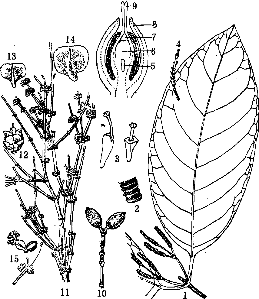 买 麻 藤 纲 (1~10为买麻藤、11~15为膜果麻黄) 分布于亚洲、美洲、欧洲、非洲热带亚热带或干旱、荒漠地区。中国有2目,2科,2属,19种,4变种,分布几乎遍及中国。 多为直立灌木或缠绕木质藤本。茎节与节间明显,木质部常具导管,无树脂道。叶对生或轮生,叶片细小膜质鞘状,或绿色扁平,或肉质带状。球花单性,雌雄异株或同株。球花具苞片2至多对,交互对生,或多数轮生,各轮苞片彼此愈合成一杯状总苞。雄花单生于每一苞片上,或多数排成数行着生于环状总苞内。花具一假花被,雄蕊2~8枚,花丝合生成一体或二体。花药内形成小孢子,小孢子以后发育为含三细胞的花粉,花粉萌发时由生殖细胞产生不游动精子。雌花单生于雌球花的顶端1~3枚苞片腋内,或4~12枚轮生于雌球花穗的环状总苞内。假花被瓶状,紧包于胚珠之外。胚珠1枚,直生。珠被1~2层,内层珠被伸长成珠被管,由假花被顶端开口处伸出。珠心发育形成雌配子体时,买麻藤目与百岁兰目均不形成颈卵器,麻黄目形成颈卵器。麻黄属的某些种中,出现1个卵与精子结合、另1个精子与腹细胞结合的受精现象。种子具由假花被发育而成的假种皮,种皮1~2层。胚乳丰富,子叶2枚。 麻黄属(Ephedra)许多种供药用,中国麻黄可提制碱性麻黄素。买麻藤属(Gnetum)许多种的种子可榨油或炒熟食用,茎皮纤维可为织麻袋、鱼网、缆索等原料。 买麻藤纲Gnetopsida裸子植物门中最进化的一纲。多为直立灌木或木质藤本。木质部常具导管,无树脂道。叶对生或轮生,叶片细小,膜质鞘状,或扁平,或肉质带状。雌雄异株或同株,雌雄球花具苞片2至多对;雄花具假花被,2~8枚雄蕊,花丝合生成一体或二体,3胞花粉,产生不游动精子;雌花的假花被瓶状,紧包胚珠;胚珠1枚,直生,珠被1~2层,内层珠被伸长成珠被管;珠心发育形成雌配子体时,除麻黄目外,均不形成颈卵器;麻黄属的某些种中,出现一个精子与卵结合,另一个精子与腹细胞结合的受精现象。种子具假种皮,2枚子叶,胚乳丰富。本纲起源于新生代。包括3个目: |