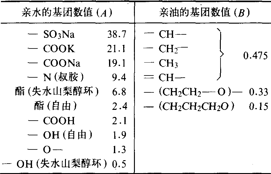 ❷把乳化剂的结构分解为一些基团,每一基团有一HLB数值(表2):
