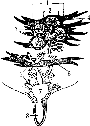 乳导管和乳腺泡系统 1.乳腺叶 2. 乳腺小叶 3.乳腺泡 4.末梢导管 5.乳导管 6.结缔组织 7.乳池 8.乳头管 |