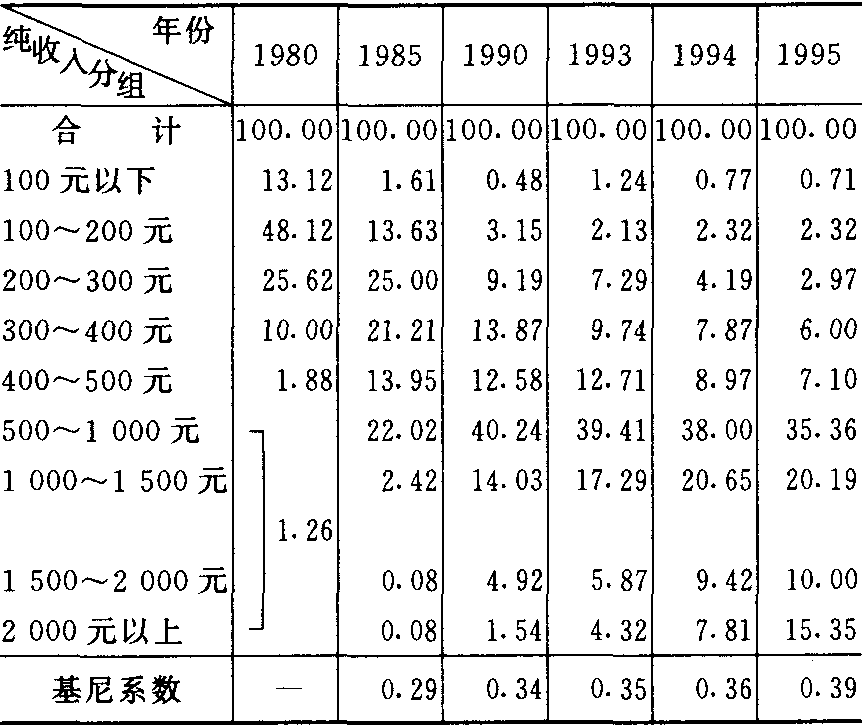 注: 本表为自治区农村调查队数 中共十一届三中全会以来,新疆农牧民收入变化具有以下特点: 1.收入稳步增长。新疆农民人均纯收入在改革开放初期1979年的143.44元锰增到1984年的362.65元,翻了1番多,年均递增20.38%;1985—1990年,农民人均纯收入稳步增长,连续突破400、500、600三个百元大关,1990年达到622.45元;进入90年代,农民纯收入仍以年递增10.70%的速度稳步增长,1991年为703元,1994年为935元,1995年为1 136.45元。 2.在全国的位次呈下降趋势。农村改革以来,新疆农民收入虽逐年增长,而且增长幅度也很大,但横向比较,新疆农民纯收入在全国30个省、自治区、直辖市的位次总的呈下降趋势。1980年新疆农牧民人均纯收入在全国排在第11位,1985年降为第14位,1990年稍有所回升,升至第13位,此后则连年下降,1991年为第14位,1992年为第15位,1993年又降为19位,1994年再次降为第22位,1995年更降到第24位。这表明新疆农牧民人均收入的增长速度同全国其他省、自治区、直辖市的差距在逐步拉大。 3.收入来源渠道拓宽。农民收入来源由过去单一以粮食为主,发展到粮食、经济作物并重,农、林、牧、渔并举,一、二、三产业并进的收入增长格局。1980年以前,新疆农民的收入基本来自种植业,在种植业中80%的收入又来自粮食。此后经济作物迅速增长,1995年人均种植业收入1 617. 76元,粮食收入仅占36. 68%,大部分收入来自棉花、油料、甜菜、瓜果等,农民人均出售皮棉的现金收入就达529. 09元。农民人均牧业收入由1980年的25. 19元增加到1995年的382. 64元,翻了3番还多。农村二、三产业从无到有发展起来。1981年以前,农民来自二、三产业的收入只占5%,到1995年人均达164. 76元。农村集体经济不断壮大,各种所有制企业不断发展。到1995年,农民人均在集体组织中劳动的报酬以及在集体企业、个体企业和其他企业劳动的报酬为64.47元。随着市场经济的发展,农村外出劳动力增多,民间租赁、借贷等活动频繁,使农民的转移性收入和财产性收入也明显增加,1995年二者合计人均为111.41元。 4.现金收入成为收入的主体。1978年以前,新疆农村基本是自给自足的小农经济,农民现金收入很少。改革开放以来,随着农村经济的全面发展,农民现金收入逐年增多,并逐步成为农民收入的主体。1993年全区农民人均现金收入 (扣除储蓄借贷现金收入) 即达1 069.29元,1994年为 1 559. 97元,1995年达到1 876. 61元,占总收入的比例上升到77. 72%。这标志着新疆农村已由自给自足的小农经济开始转向商品经济。 5. 收入差距逐步拉大。1980年新疆人均纯收入在200元以下的农户所占比例高达61. 24%,80年代中期就迅速下降为12. 02%,以后各年逐步下降,到1995年仅占3.03%; 人均纯收入在200~500元之间农户也由1980年的37. 5%下降到1995年的16.07%; 而人均纯收入在500~1 000元之间农户则由1980年约占1. 26%上升到1995年的35. 36%; 人均纯收入在1 000元以上的农户在80年代初还为数很少,到1990年已占到20.49%,1993年达27.48%,1995年达到45. 54%。 新疆农民收入在普遍提高的基础上,不同地区之间、农户之间的差距逐步扩大,由高度平均逐步向相对平均过渡。新疆农民收入的基尼系数在“六五”期间为0.2左右,“七五” 时期突破0.3,“八五”时期达到0. 39。见表10-3-3。