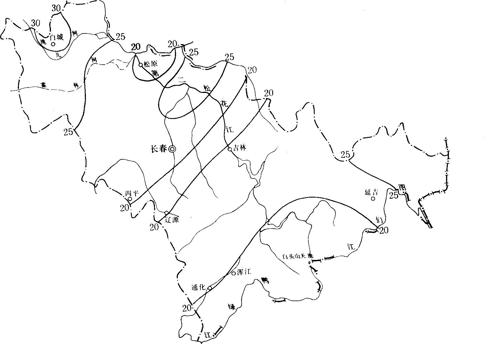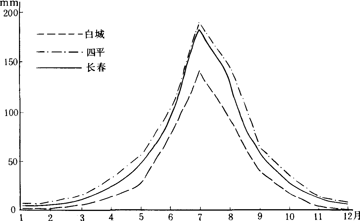 (4)年降水量变率。降水变率就是历年降水量的平均变幅与历年平均降水量之比的百分率,它反映了该地降水量年际变化的稳定程度。全省年降水变率以平原地区和近海处相对较大,山区较小。白城地区西部在20%以上,白城达21%,长春地区、吉林地区北部、白城地区东部、延边地区东部在15%以上。延边地区西部、吉林地区南部、通化、浑江、四平地区在15%以下,梨树、双阳、长白、松江仅11%,为全省最小。 (5) 4—9月降水量变率。4—9月降水量变率可反映出全省作物生长季降水量的稳定程度,此期降水量变率的大小,对农业产量有着直接影响。统计结果表明,全省降水量变率地域差异较大。白城地区、长春地区西北部、延边地区东部,在20%以上;延边地区西北部、长春、吉林、辽源三地区交界处,浑江地区、通化地区南部、以及延边地区西南部在15%以下;其他地区在15%-20%之间。总的来看,4-9月降水量变率西部平原地区和东部沿海地区较大,易引起旱涝;中部地区特别是东南部山区降水量变率较小,相对比较稳定,见图1-2-11。