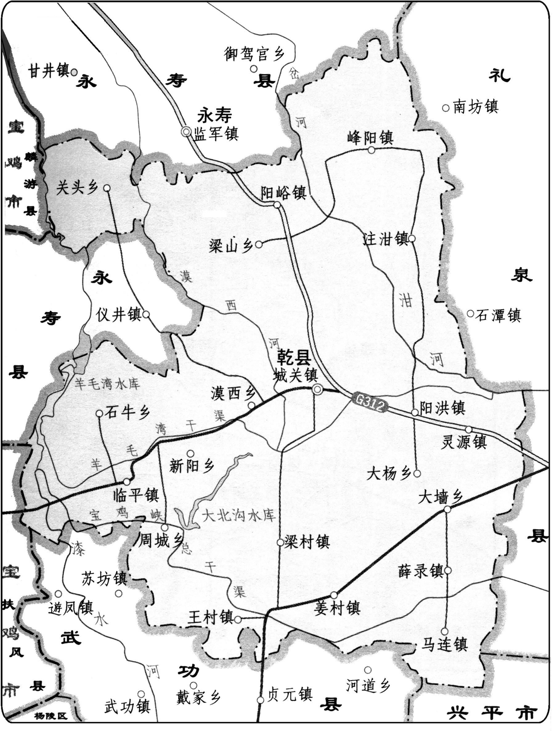 乾县政区图 乾县1913年将清乾州直隶厅改置乾县。治所在今吉首市乾州。属辰沅道。1914年改名乾城县。 乾县咸阳市辖县。位于咸阳市西北部47公里处,东至礼泉,西到扶风,北接永寿,南邻武功。东西宽37公里,南北长48公里。面积994平方公里,其中耕地100.23万亩。地处鄂尔多斯地台南缘与渭河断裂盆地的结合部,北高南低,平均海拔712米。自然地形分为南、北、中三个部分。北部旱原,沟壑纵横,丘陵起伏,海拔在867~1475米之间,面积为488平方公里;中部地势平坦,为肖河古道,海拔在530米左右;南部黄土高原,地面平缓,海拔在600米左右。县城海拔636米。漠谷河纵贯南北,境内流程48公里,常流量0.1立方米/秒,最大流量20立方米/秒,将县域切割为东、西两部分,俗有东乡、西乡之称。还有两条自北而南的河流,一条是漆水河,另一条是泔河。其中漆水河较大,流域面积78.4平方公里,境内流程24公里,常流量2.65立方米/秒,最大洪流量820立方米/秒。全县常住人口49.9万,其中农业人口46.29万。境内居民以汉族为主,占总人口的99.97%,还有回、藏、满等少数民族。辖城关、临平、梁村、薛禄4镇和阳洪、注泔、灵源、大杨、大墙、长留、杨汉、马连、姜村、王村、漠西、新阳、周城、石牛、关头、乾陵、铁佛、梁山、吴店、阳峪、峰阳21个乡。县政府驻城关镇。唐高宗取葬县北梁山,陵墓位于古长安西北方向,按八卦之说属“乾”之位,故“陵”称乾陵,县称乾县。该地古属周国,为西周王畿。东周时属秦国。秦孝公十二年(前350),在今县城东7里好畸村置好畸县,属内史郡,西汉属右扶风,东汉建武六年(30)入池阳县,西晋复置好畸县,属京兆郡。北魏太和十一年(487)分好畸在今县城西南的老巨州村再置漠西县,同属武功郡。北周武帝建德三年(574)并好畸入漠西,属扶风郡。隋开皇十七年(597)改漠西县为上宜县,县治迁至今永寿县上宜村,后又分上宜置好畸县,后再改好畸为上宜县。贞观八年(634)废上宜入岐阳县,后复置上宜县,再改为好畸县,属京兆郡。文明元年(684)在唐高宗李治陵寝处置奉天县,同时筑奉天城 (即今县城)。乾宁二年(895)在奉天兼置乾州,先属京兆府,后属奉元路,明属西安府,清属直隶州。1912年改乾州为乾县,属关中道。1927年直属陕西省,1937年属陕西省第七行政督察公署。1949年解放后,属邠县分区行政督察专员公署。1950年6月改属宝鸡专区。1956年元月直属省辖。1959年元月将永寿、醴泉并入乾县,1961年又分置,属咸阳地区。1983年咸阳地区改为咸阳市,遂为市辖。乾县是唐高宗李治和女皇武则天合葬之地,因而陪葬墓甚多,出土文物甚众。计有太子墓2座、王墓3座、公主墓4座、大臣墓8座。1960年以来,先后发掘的永泰公主、章怀太子、懿德太子、中书令薛元超、燕国公李瑾行等5座陪葬墓,出土珍贵文物4300多件。乾陵在县城北6公里的梁山上,海拔1047.9米,呈圆锥形。陵依山修建,规模宏大,气势雄伟。陵巅建有阙楼。陵下司马道两侧对称排列着华表、石马、石鸟、石人、石碑等百余尊 (通),尤以无字碑最为闻名。另外,县城东北7.5公里处还有唐第18代皇帝僖宗李儇与惠圣安孝皇后的合葬墓靖陵。历史名人主要有元代文士杨焕,李自成的吏部侍郎宋企郊,清兵部尚书王郡,清代山水画家马震,同盟会早期会员吴聘儒,乾县地区中共党的创建人之一严念先,台儿庄战役中殉国的高鹏,为掩护主力红军安全撤离而牺牲的红二十八军参谋长杨森,西安易俗社的创办人之一、剧作家范紫东,杰出的外交家王炳南等。境内矿产资源主要有石灰石,碳酸钙含量在97.25%以上,已探明储量3000亿立方米。动物资源以秦川牛为主,是陕西省和全国秦川牛基地县之一。林果资源主要是苹果、梨、广杏、御石榴。该县是一个古老的农业区,农作物在北部一年一熟,在中、南部两年三熟或一年两熟。粮食作物以小麦为主,玉米、谷类次之;经济作物主要有棉花、油料、烤烟、林果等。拥有大、中、小型水库15座,总库容1.57亿立方米;抽水站227座,总装机量1.98万千瓦;机井1000多眼,总装机量1.26万千瓦;宝鸡峡、羊毛湾、泔惠渠、乾陵水库4个灌溉系统; 水浇地62.14万亩,占耕地总面积的62%;吨粮田10万亩;1990年粮食总产2.44亿公斤。向国家提供商品粮7800多万公斤。是陕西省粮食基地县之一,被国务院评为粮食生产先进县。棉花种植1万亩,油料7.7万亩,总产分别为27万公斤和781.1万公斤。大家畜存栏3.78万头,生猪9.87万头,羊1.55万只,鸡48.2万只。年产肉类454万公斤,鲜奶229.2万公斤,禽蛋79.6万公斤。全县林地15.32万亩,木材总蓄积8.1万立方米;果林9万亩,总产614.2万公斤。柿子个大、皮薄、肉厚、味甜、耐储存,是历史上的“出境要品”,远销四川、青海、东北、广州、香港等地。1990年农业生产总值1.64亿元。工业主要有化工、机械、电子、建材、纺织、工艺美术等行业。共有各类工业企业117户,职工5600多人,总产值1.1亿元。轻质碳酸钙和仿制、复制的出土文物,远销欧美和世界各国。乡镇企业发展到6700多个,从业人员3.6万多人,占农村劳动力的18%,总产值和总收入均突破2亿元。境内公路交通方便,西(安)兰(州)公路贯穿全境,还有15条200多公里的柏油路通往礼泉、兴平、武功、扶风等邻县以及县内各乡镇。有邮电局 (所)20处,服务网点470个; 开设邮政线路3条,总长224公里;农村投递线路27条,总长1145公里。电话交换机总容量2750门,电话机总数1000余部。年邮政