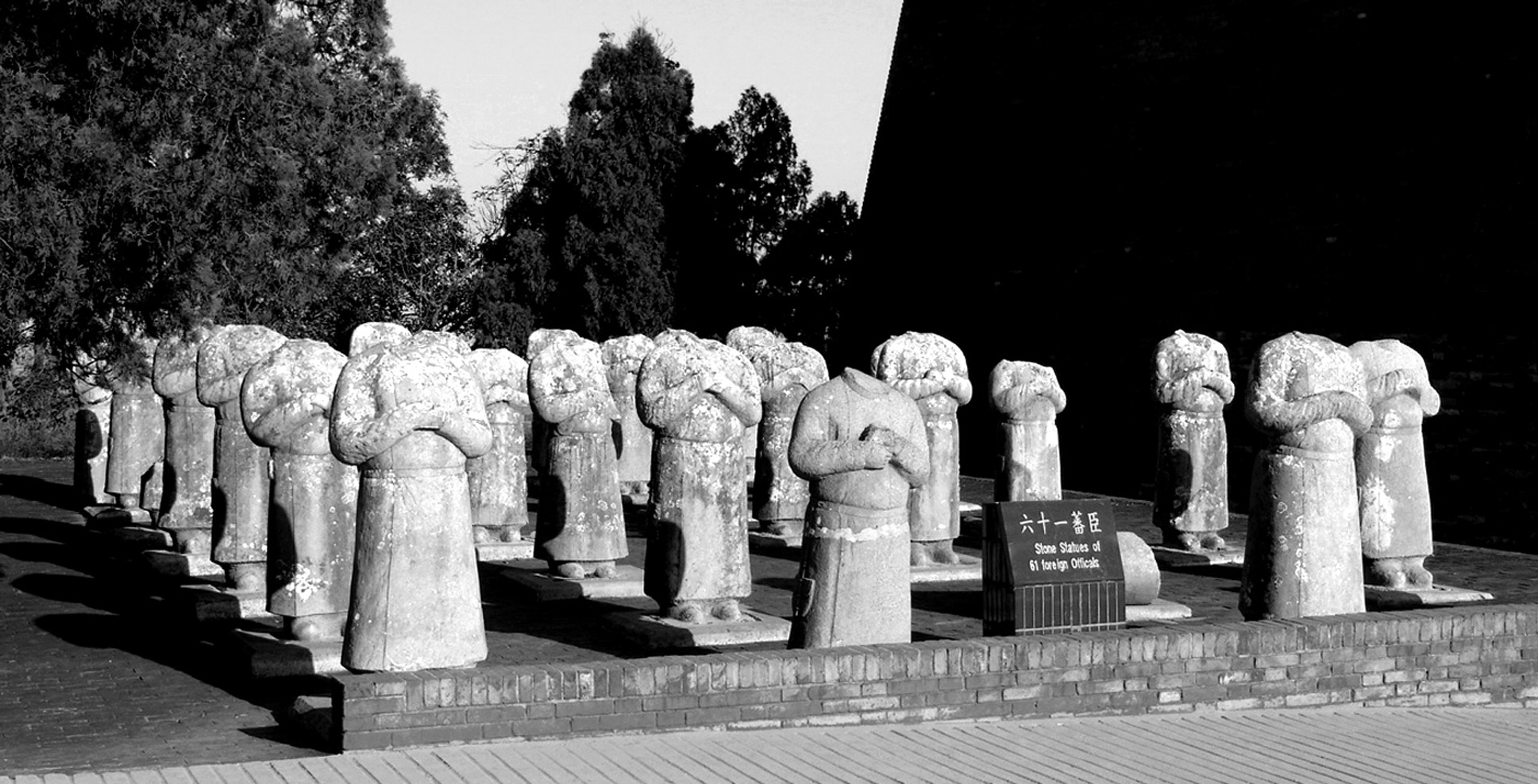 | 释义 | 乾陵石刻王宾群像qiɑnlinɡ shike wɑnɡbin qunxiɑnɡ又称“六十一蕃臣像”、“蕃臣曾侍轩禁者”像。唐高宗与武则天乾陵陵前石雕。圆雕。位于南神门外阙址以北18米处。东西分列,现存东列31位,西列30位,共61位。头部皆残缺,个别仅存下半身。石像服饰、发型不尽相同。多穿窄袖阔裾服装。有圆领、大翻领或斜叉领。有卷发、披发。均腰束带,脚穿靴,双足并立,两手前拱,作侍立状。石像背后刻有国名、官职和姓名,可见者有“木俱罕国主斯陁勒”、“于阗国尉迟璥”、“吐火罗王子羯达健”等。大多刻文已风化剥蚀,无从辨识。群像东西两边均为南北4行,东西8排。东列群像范围东西为15.44米,南北为7.47米;西列群像范围东西为15.15米,南北为7.35米。石人均足连石座,座为方形,边长90厘米。残像身高一般为150厘米左右,最高者存177厘米,最低者仅存46厘米。此群像不仅反映了盛唐时期高超的石刻艺术水平,也是当时各民族友好往来的见证。现仍存乾陵原地。
