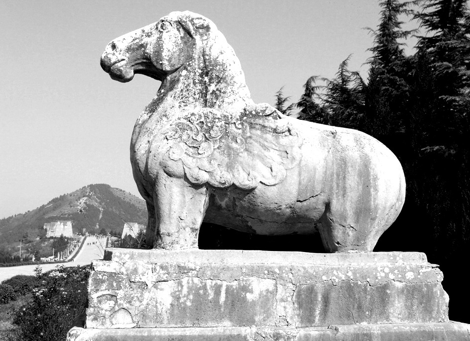 | 释义 | 乾陵翼马唐代石雕。乾陵御道两旁,列置有翼马一对,圆雕。马高3.17、长2.8米,下有1.25米高的双层座。马形体高大,厚实,稳重,颇有气势;昂首,竖耳,瞠目,面相劲挺,颈较短,肩部镌刻流云纹组成的双翼,象征唐王朝的祥瑞,在我国大型陵墓石雕中尚属仅见; 造型继承了南朝辟邪的特点,颇有创造性和力度感,雕刻技法精熟。 乾陵翼马qiɑnlinɡ yimɑ唐代。1对,置于乾陵司马道。唐睿宗文明元年(684)前后刻。圆雕。高317厘米,长280厘米。为神话传说中的神马。马昂头站立,圆目直视,颈项两侧分披鬃毛,翼卷曲。颈和腿都较粗短。腹下透雕。翼面重叠转折,双翼展于前肢上部,刻浮雕云纹,有腾云驾雾之势,形神兼美。翼马四足和尾与石座相连,石座四周线刻各种纹饰。
