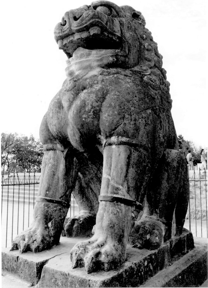 | 释义 | 乾陵蹲狮qiɑnlinɡ dunshi唐代。1对。乾陵陵前石刻,立于乾陵南门(即朱雀门)外左右两侧。唐睿宗文明元年(684)前后刻。圆雕。高335厘米,长332厘米,宽130厘米。体态高大,昂首挺胸,圆眼突出,张口吐舌,雄健威武。前肢挺立前伸,后腿稍屈,身躯后压,似有刹那间纵起前扑之势。整个造型呈“金字塔”状,显示出蹲狮有顶天立地,“唯我独尊”的气势。