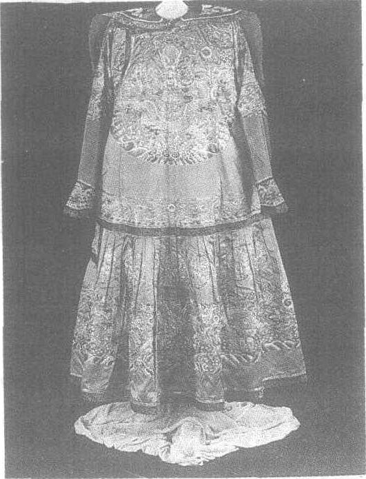 | 释义 | 乾隆皇帝月白缎绣云龙袷朝袍清。身长143厘米,两袖通长194厘米。北京故宫博物院藏。这件朝袍由披领、上衣、衣袖、罗纹素缎接袖、马蹄袖端、腰围、襞襀、衽、裳等组成。朝袍在蓝白色的朱子底绢上绣有43条龙纹和12章纹,在金色龙纹的间隙,还穿插有云纹、蝙蝠、暗八宝纹、寿字纹,并在每个主要装饰部位的周围饰有水浪纹、寿山纹,并夹有合称八宝的金锭、银锭、珍珠、犀角、如意、方胜、珊瑚、钱纹,交互配置金丝和白金线。配色采用三晕色,有红、粉红、水粉、蓝、浅蓝、月白、深绿、浅灰、浅雪灰、白色等,再加捻金线勾边,并利用了绢的光泽及朦胧手法的巧妙运用,使色彩更加华丽。袍里衬以湖色暗花四枚缎纹绫。朝袍的大襟纽扣上系有黄签条,一面写有“绣月白缎面片金边袷朝袍一件”,另一面写“高宗”字样。