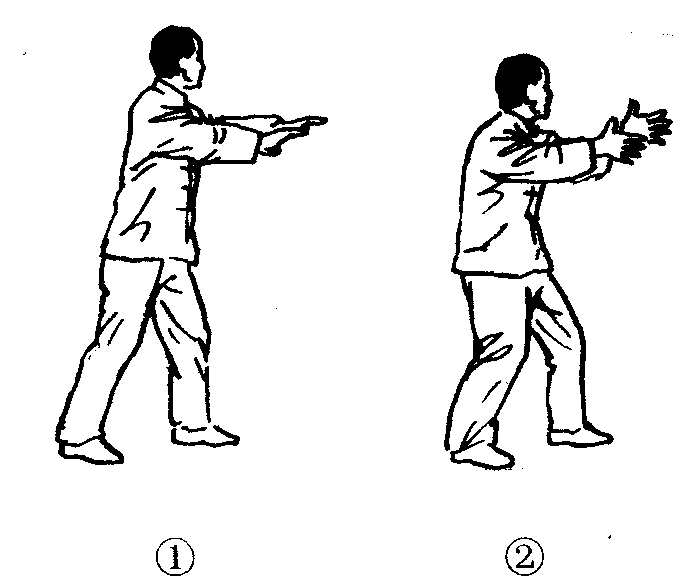 大成拳的基本试力之一。预备式为左技击桩。动作过程:向前做时,右腿蹬地,便身体重心移至左脚,在移动的过程中,左腿要有向后撑地的力量;同时两大臂抬起,小臂内旋使两手心向下,两手成基本手型,手指向前;左手微偏在前,头要上顶,目斜视前方。(图2—4—84❶)向后做时,上体略向右倾,同时左腿蹬地,把重心蹬回至右脚内侧;右腿在左腿蹬地时要有向前顶的力量。(图2—4—84❷)动作要领:向前推时整体要有向后撑的意识,两臂既要随身体向前推,又要向外撑;向后拉时整体要有向前顶的意识。两臂既要内夹又要外撑。意念:身体站在齐胸的水中,推拉一棵浮在水面的大树(双手握大树的一端)。注意事项:争裹拧抱试力的动作缓慢,用意适中,颇适合老年人练习。老年初学者在练习时可先学会腿的用力方法,再配合上肢动作进行练习。