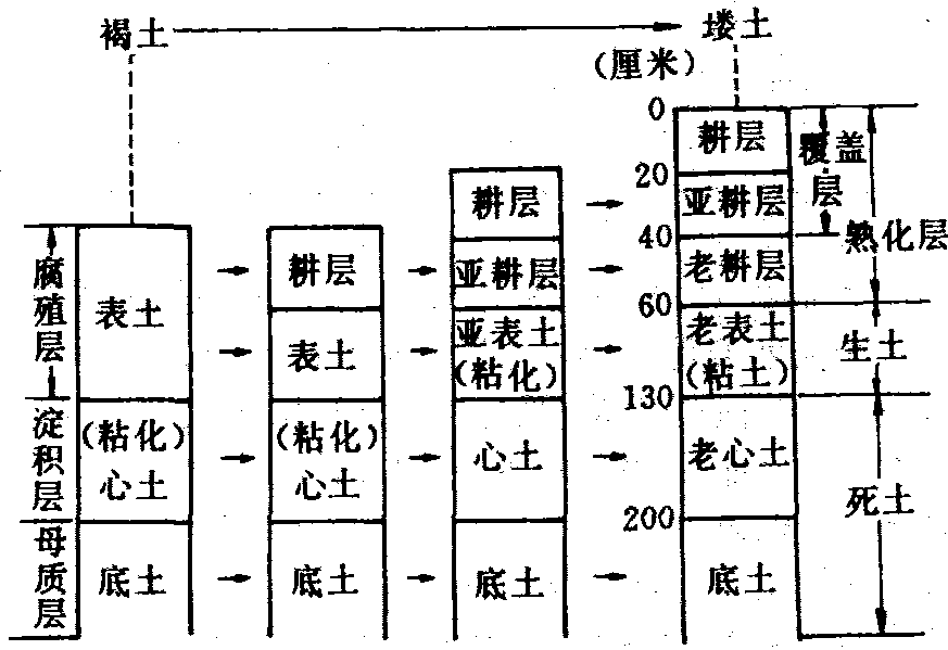 𪤁土 下伏石灰性褐土,分布在关中东部较温暖而干旱的地区,由于地面起伏较大,耕作较粗放,侵蚀强烈,覆盖层较薄,结构性差,适耕期短,浇墒现象严重。 黑瓣𪤁土 下伏草甸褐土,主要分布在一级阶地(川地)和塬上的洼地底部,这里灌淤堆积明显,洪涝淤积频繁,土壤腐殖质含量较高,下部粘化层呈黑褐色瓣状,结构面有黄色铁锈斑。一般施用肥料较多,覆盖层较厚,养分含量丰富,土壤水分多,肥力和产量较高,但耐旱不耐涝。 利用改良 𪤁土是人类长期耕作、培育的一种农业土壤,宜种植小麦、玉米、棉花、谷子及豆类等多种作物。𪤁土的改良培肥措施,首先,要平整土地和注意深耕。在原来浅耕13~16厘米基础上,机械深耕26厘米,就能改善蓄水供水,有一定程度的增产。其次,要增施有机肥料,在轮作中保持一定比例的多年生牧草,如苜蓿等。以增加耕层有机质和养分,改善土壤结构和培养地力。施用氮磷化肥和钼、锌、锰等微量元素,是提高农作物产量的重要措施。塬地尤其是对边坡地应重视水土保持,如在边坡地植树、种草,在缓坡地实行等高种植,带状间作,筑地边埂,做好沟头防护等(见彩图37)。 𪤁土一种熟化度较高,具有埋藏耕层的古老旱作土壤。分布在陕西关中平原渭河和晋西南汾河河谷阶地上。土壤上部因长期耕作和施用土粪肥,形成深厚、疏松通透的熟化层。下部是经过耕作的暗色褐土层。两者迭置,层次清楚,一上一下尤如楼房,故名𪤁土。土壤有石灰反应,微碱性,肥力较高。 𪤁土lou soil褐土分布区域经长期施用土粪堆积覆盖和耕种熟化而形成的一种耕作土壤。主要分布于陕西关中和山西南部的河谷阶地及洪积黄土台地。具有重叠的土壤剖面,上部为厚度>50 cm的堆叠熟化层,下部是埋藏的褐土。具有黏化和碳酸盐积聚过程,通体有石灰反应,土壤pH7.5左右。土体中胡敏酸同富啡酸比上部1.05左右,下部1.20~1.50。熟化层的黏土矿物与黄土母质相似,以水云母为主,下伏褐土以水云母和蛭石为主。 𪤁土是古老的耕作土壤,熟化程度和肥力水平较高,适于种植冬小麦和棉花等多种作物。 𪤁土loutu在自然褐土的基础上经过长期的侵蚀、搬运、沉积并由人们耕种施加土粪熟化而成的耕作土壤。由自然褐土和熟化层两个层段构成。是市域南部关中平原区的主要农耕土壤,分布于渭河二级以上阶地和黄土台原,以秦都区、渭城区、兴平市、武功县、泾阳县、三原县以及乾县、礼泉县的南部分布最广泛,面积约29.96万公顷,占全市土壤总面积的28.95%。土壤较肥沃,适宜种植多种农作物。土层深厚,保蓄水分、养分性能强,尤其是“蒙金型”的土体构型,更有利于蓄水和保存供应植物养分,耕层疏松,耕性好,适耕期长;粘化层托水保肥,耐旱耐涝,后劲足。有𪤁土亚类和油土、潮𪤁土、𪤁化土四个亚类,其中油土、𪤁化土肥力最高。 𪤁土一种熟化度较高的古老耕种土壤。是褐土基础上长期耕种熟化的土壤类型。主要分布在陕西关中和山西西南部的汾河、渭河谷阶地上。占陕西省耕地面积的18%,是关中地区最重要的农业土壤。因久施土粪,熟化层较厚,疏松易耕,有机质含量约为1%~2%,其下为原褐土的腐殖质层、粘化层和钙积层。𪤁土抗旱保墒性均比原褐土增强。 |
