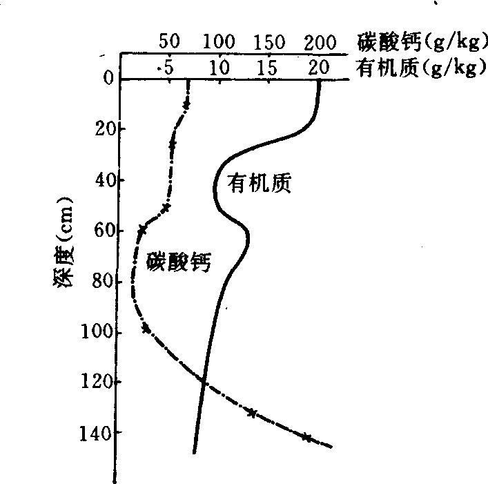 𪤁土的熟化覆盖层厚度因地面坡度,距分水岭远近,土地利用历史和土壤侵蚀程度等不同而异,厚的达60~80厘米,薄的不过20~30厘米,有的覆盖层全部被侵蚀而露出原褐土的钙积层或母质,变为当地农民称之为“白𪤁土”(见彩图36)。 基本性状 ❶形态特征,𪤁土剖面构造可分成两大层段:上部层段是熟化覆盖层,包括耕作层、犁底层、老耕作层,其厚度一般为50厘米左右;下部为下垫褐土层,可清楚辨认出原褐土的古耕层、粘化层、钙积层、母质层。耕层成土年龄短,受耕种影响大,由于每季耕翻,年年施土粪,故比较疏松,粒状结构。犁底层经常受耕犁挤压,比较紧实,厚约10厘米,其下为老耕层,多孔洞,稍疏松,常见碳渣,瓦片等(见彩图36)。 ❷土体深厚,适于深耕。由于上层疏松通气,下层土壤较粘紧,提高了土壤透水蓄水、抗旱保墒、保肥供肥的性能。 ❸𪤁土耕性的差异与土粪中黄土原料的质地有关。关中西部的黄土原料质地较粘,东部的较粗。粘性的𪤁土耕性差,适耕期短,常有浇墒现象。质地轻的,施肥量多的,熟化度高的𪤁土耕性亦好。 ❹因耕后疏松通气有机质易于矿质化,故有机质含量及全氮量不高,但磷、钾、钙、镁等矿质养分较丰富。(见表)。 ❺𪤁土覆盖层粘土矿物与黄土相同,主要为水云母,下伏褐土则以水云母和蛭石为主,土壤盐基饱和,呈微碱性,阳离子交换量10~15厘摩(+)/千克。各土层的碳酸钙含量变化较大,覆盖层碳酸钙含量大,这与土粪中黄土的碳酸钙含量高有关;下伏褐土原表层为碳酸钙淋失层,下部为碳酸钙淀积层,碳酸钙含量差异大,因耕种期内富钙表层的淋溶作用引起下伏褐土原上部石灰淋失层重新淀积碳酸钙(见图2)。 𪤁土的化学性质