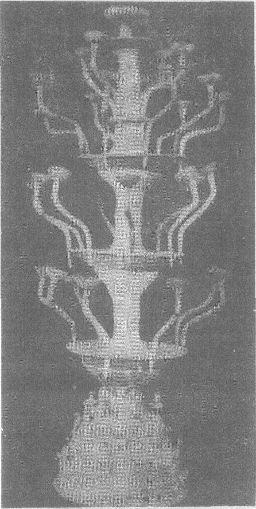 | 释义 | 二十九枝连盏陶灯汉。高142厘米。1985年河南省济源县承留乡出土。陶连枝灯多出土于东汉墓中,但如此高大,灯盏多达29枝的较为少见。全灯由盘、柱、盏、座组成,通体以白衣装饰,涂有朱砂,灯盘为浅腹式,平沿上均有8个圆孔,用以插灯盏。灯盏则以曲柄支撑。此外上部灯柱的腰沿处另有4个插灯盏的圆孔。灯座类似腰鼓形,上有四组雕塑图案,有捧桃的人物,山峰以及奔跑的鹿、羊、兔等动物,极富生活情趣,装饰性亦强。