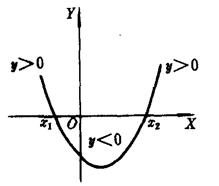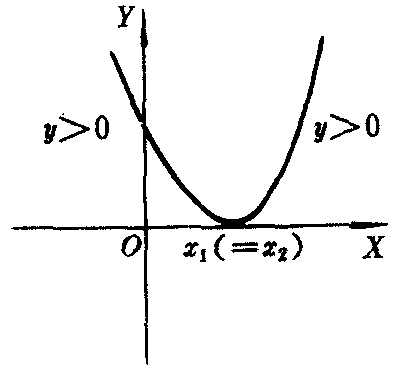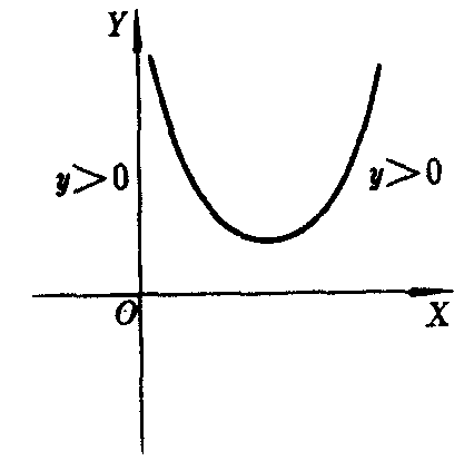 图5 如果△=0,方程ax2+bx+c=0有两个相等实根x1=x2=-b/2a,抛物线y=ax2+bx+c与X轴只有一个交点(如图4),那么,不等式ax2+bx+c>0的解集是所有不等于-b/2a的实数.而不等式ax2+bx+c<0的解集是空集;如果△<0,方程ax2+bx+c=0无实根,抛物线y=ax2+bx+c与X轴没有交点(如图5),那么,不等式ax2+bx+c>0的解集是全体实数.而不等式ax2+bx+c<0的解集是空集. |