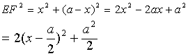 例如,函数y=2x2-3x+1,当x=3/4时,y有最小值-1/8.又如函数y=-(1/3)x2-2x+3,当x=-3时,y有最大值6. 在求某二次函数的最大(小)值时,常采用配方法.如对于函数y=2x2-3x+1,将其解析式配方,变为y=2(x-3/4)2-1/8,由此可知当x=3/4时,y有最小值-1/8. 求二次函数的最大(小)值有着广泛的应用.例如,求正方形的最小面积的内接正方形(各顶点分别在原正方形边上的正方形,称为原正方形的内接正方形).如图,正方形ABCD,依次在各边上取点E,F,G,H,使EFGH为正方形.很容易知道,AE=BF=CG=DH.设AB=a,AE=x,则正方形EFGH的面积为