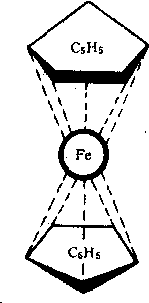| 释义 | 二茂铁ermaotie又称二环戊二烯合铁。1951年P.L.保森为了制备富瓦烯,用三氯化铁氧化环戊二烯格氏试剂[(C5H5)—Mg—Br],结果未得到预期产物富瓦烯,却得到了一个橙色、稳定的新配合物(C5H5) 2Fe,称之为二茂铁。其反应历程是Fe3+首先被(C5H5)—Mg—Br还原为Fe2+,然后Fe2+与(C5H5)—Mg—Br反应生成(C5H5)2Fe。它有类似樟脑气味,熔点为172.5~173℃,100℃以上升华,沸点为249℃,有抗磁性,不溶于水,10%氢氧化钠和热的浓盐酸溶于稀硝酸、浓硫酸、苯、乙醚、石油醚和四氢呋喃等,在空气中稳定。进一步研究表明,它是过渡金属有机配合物中含有芳香性有机基团的一个代表性物质,具有特殊的化学稳定性,而且具有特殊的分子结构。X射线衍射分析指出,其偶极矩为零,其中C—H键全都相同,C—C键长为140 pm,而C—Fe键长为204 pm,两个环状C5H5基间的距离为332 pm。1952年E.O.费希尔和G.威尔金森同时确定该化合物具有新型的“夹心面包结构”,Fe原子位于两个环状C5H5的五边反棱柱排列之间 (见图)。由其分子轨道能级图可看出,二茂铁中Fe2+的6个价电子和两个C5H-5环的 12个电子,共18个电子,分别填入a1g,a2u,e1g,e1u,e2g,a1g分子轨道中,由于分子中无单电子存在,故二茂铁为抗磁性。此外,铁原子经两个茂基配位后,核外电子总数为36,相当于希有气体氪Kr的原子结构,完全符合E.A.N规则,相当稳定,1955年以后逐步发现了一系列类似的化合物,通称夹心结构化合物,其中的“心”指金属原子或离子,正如两个面包片 (指有机基) 间的肉一样,也称做茂金属化合物。二茂铁的合成,开辟了含有π键合的芳香环的过渡金属有机金属化学的新领域。有关的结构理论研究,推动了金属有机化学的迅速发展,对无机、有机化学和理论化学都产生了极其重大的影响。为此E.O.费希尔和G.威尔金森共同获得1973年诺贝尔化学奖。