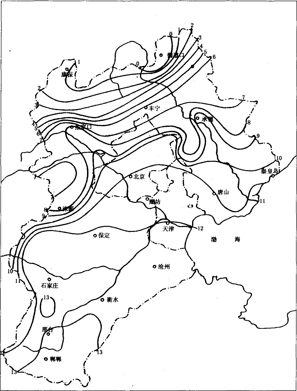 图1-2-1 年平均气温 (℃) 各地低温日数,≤0℃日数,冀北高原可达180~230天,冀北山地150~180天,冀东120~140天,中南部平原100~120天。≤-10℃低温日数,全省各地为8~153天,冀北高原在100天以上,冀北山地70~100天,中南部平原在25天以下。≤-20℃日数主要出现在冀北高原和山地,其他地区平原每年出现日数不足1天。≤-30℃的日数仅高原可出现。 |