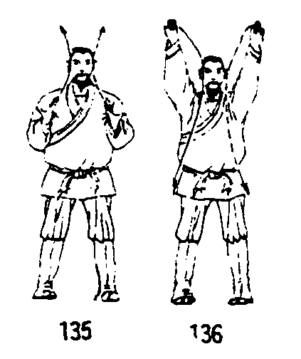 四十九式经络动功第3段“导气”动作之九(全套动作顺序第三十一式):随着吸气,提肛调裆;两掌经腋下向脑后直上伸出,掌心朝后,两臂伸直呈双龙吐须状;同时脚跟拔起;眼平视前方。(图135、136)要点:百会上顶,身体中正,脚跟尽量提起,脚趾似入地生根。