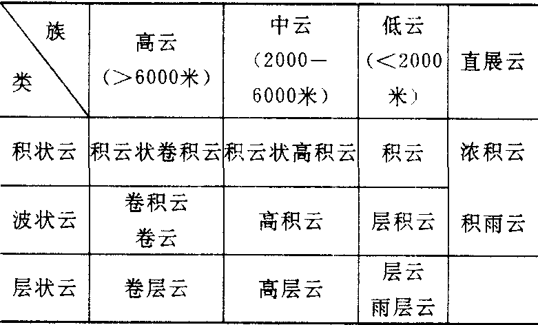 ❷中云族:云底高度在2 000—6 000米间,由过冷水滴(低于0℃而不冻结的水滴)和冰晶组成,呈灰白色层状或块状。天空好似铺上了一层毛玻璃,太阳位置清楚可见;有的像棉絮或城堡。这类云有时有连续性或间歇性降水。 ❸低云族:云底高度在2000米以下,有时可接近地面,多由水滴,或水滴和过冷水滴组成。一般云层较厚,呈深灰或灰白色,其中有的云(雨层云)能产生连续性的降水,有的云(层云)可能降毛毛雨。 ❹直展云族:云底高度平均500米左右,云顶高者可达卷云高度。云一般由水滴或水滴和过冷水滴组成。云体高大,有如耸立的高山,发展强盛的积雨云可降强阵雨,伴有大风、雷电。有时还有冰雹出现。 云是由无数的小水滴或冰晶,或二者混合组成的,而大气中的水汽怎样才能形成飘浮在空中的水滴和水晶呢?水滴、冰晶是在大气中水汽含量超过饱和水汽量时,多余水汽发生凝结的产物。而造成和维持大气中水汽过饱和状态有二条途径,一是增加大气中水汽含量,达到非常丰富的程度;二是降低大气的温度,进而降低饱和水汽量。在自然界中要使地面蒸发大量水汽输送到高空并达到过饱和程度是相当困难的,而通过降低温度减少饱和水汽量是经常发生的、也是十分有效的。高空大气中的水汽凝结过程几乎全是气温降低的结果。高空大气如何才能降低温度?可能有多种过程,而最有效的过程是空气的上升运动。如果气流上升3 000—4 000米,气温就会下降30多度,使饱和水汽量大幅度减少,达到过饱和发生凝结,产生水滴或冰晶,可见气流上升运动是云形成和发展的关键条件。只要那个地区发生上升运动而且上升幅度足够大,那个地区上空就可能生成云,上升运动越强烈,幅度越大,云发展得就越迅猛,云层就越厚。相反,在没有上升运动,甚至出现气流下沉的地区,云就不会产生,即使原来有云也会渐渐减弱以至消失。天空中云的千姿百态和变幻无穷,恰恰是气流上升形式不一、规模不同和运动状态不断变化的反映。 云悬浮在大气中的小水滴或(和)冰晶微粒组成的可见聚合体。是空气中水汽冷却凝结所致。按照云底的高度,一般分为高云、中云、低云3族。云的形成、发展、消亡是大气中特定的物理过程的产物,反映了大气状态的变化,在一定程度上具有预示未来天气变化的作用。 云悬浮于空中的小水滴或冰晶组成的聚合体。❶大范围辐合抬升生成的层状云(卷云、卷层云、高层云、雨层云),水平尺度1000 km,厚度10 km,上升气流1~10 cm/s; |