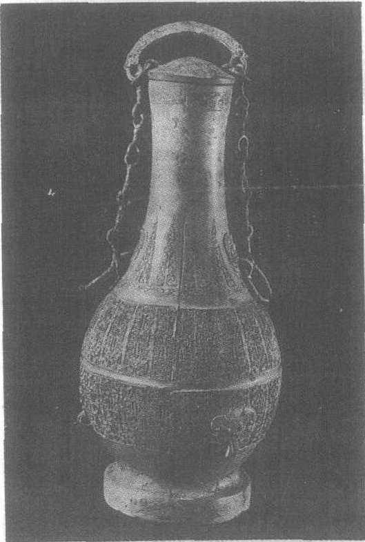 | 释义 | 云纹提梁铜壶战国。盛酒器。通高37厘米,腹径17厘米。1957年湖南省长沙市烈士公园出土。湖南省博物馆藏。此壶小口,长颈,有链式提梁。口上有小圆盖,两侧各有一铺首钮,贯环。肩部饰三角云纹,两侧亦各有一铺首衔环,并有链与盖环相连。膨腹,圈足。腹饰以席纹为地的变形云纹,下部有三个兽面,但不衔环,非常少见,可能是为系带之用,便于提携。