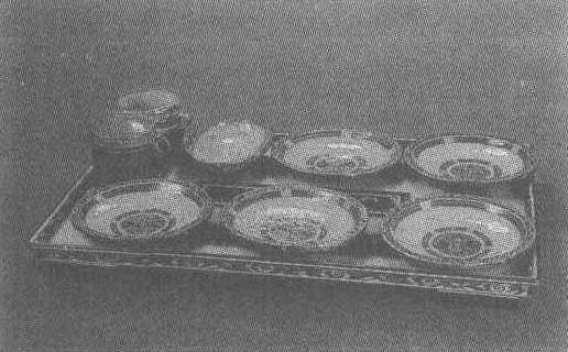 | 释义 | 云纹漆案及漆杯盘西汉。高5厘米,长60.2厘米,宽40厘米。1972年湖南省长沙市马王堆1号汉墓出土。湖南省博物馆藏。案是古代进食用的盘。此案木胎,长方形,平底,底部四角设有2厘米的矩形足。案内髹红、黑漆地各两组,交错分布,并在黑漆地上,饰朱、灰绿两色云气纹,外壁黑漆地上,绘朱、褐两色几何云纹。底部髹黑漆,并书以朱漆“轪侯家”三字。案出土时,上面附置5个小漆盘,1个耳杯,2个卮,1双竹箸和竹串等。盘、杯、卮的装饰手法与案相似。小盘底内均有朱书“君幸食”三字。有人认为,这种陈设可能是模拟死者生前宴饮的情景,它为研究汉代生活习俗提供了重要实物资料。此案与盘、耳杯、卮等纹饰流畅,色泽明亮,是西汉漆器的优秀作品。