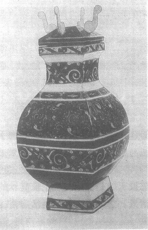 | 释义 | 云纹漆钫西汉。通高51.5厘米,口长、宽各13厘米。1972年湖南省长沙市马王堆1号汉墓出土。湖南省博物馆藏。钫即盛酒或粮食的方形壶,盛行于战国至西汉。此钫木胎、直口、平唇、鼓腹、圈足。盝顶形盖上,设四个“S”形橙黄色钮。内髹朱漆,表面在黑漆底上,用红、灰绿两色绘以鸟头、菱形纹、卷云纹、云气纹和“米”字形纹,颈、肩、腹、圈足上分别饰一条较宽的朱漆带,器外底部朱书“四斗”二字,圈足外有戳记,可惜字迹已模糊不可辨。马王堆1号汉墓计出土四件钫,形制、大小均相同,此为其中之一,出土时,内残存有酒类沉渣。经实测此钫可容酒7850毫升,平均每斗容196.25毫升。