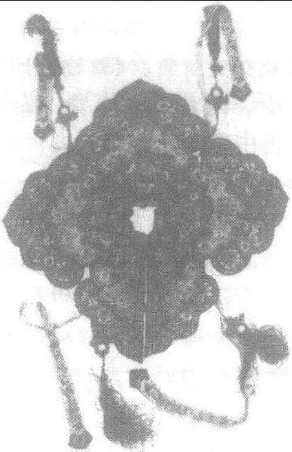 云肩 云肩亦称“肩披”、“搭肩”。云肩形制为如意云式,以锦制成。饰有坠线,并以云纹织成的纹绣为饰,披于肩上,故称 “云肩”。从出土文物中发现,传说中人类的始祖女娲和伏羲的颈部都覆有一层披肩,可为后来云肩的前身。“云肩” 一词,出现在金代,金代画家在《文姬归汉图》中所画文姬的肩上便饰有云肩。元代,云肩多为宫中仪卫及舞女所用。且形制已被固定下来。据《元史·舆服志》载: “云肩,制如四垂云,青缘,黄罗五色,嵌金为之。”明、清则是宫中及贵族妇女的礼服之饰。造型更是别致精美。清初文人叶梦珠在 《阅世编》 中曾作如下描述: “内装领饰,向有三等: 大者裁白绫为云样,披及两肩,胸背刺绣花鸟,缀以金珠、宝石、钟铃,令行动有声,曰宫装。次者曰云肩。小者曰阁髩。其绣文缀装则同。近来宫装,惟礼服用之,居常但用阁髩而式样亦异,或剪裁为金莲花,结线为缨络样,扣于领而倒复于肩,任意装之,尤觉轻便。”清代汉族妇女在新婚大礼时,也必穿着云肩。