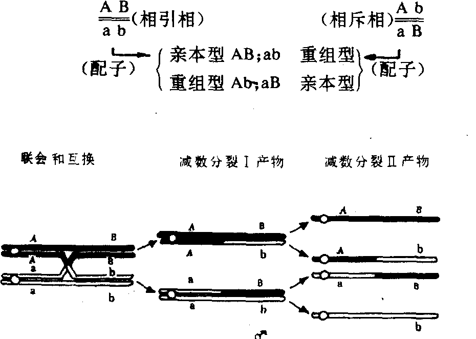 | 释义 | 互换huhuan两同源染色体的非姊妹染色单体间相应节段的交换。生物在形成配子过程中,初级性母细胞进行减数分裂。在减数分裂的第1次分裂(减数分裂Ⅰ)的前期,同源染色体配对(联会)形成四分体,且在基因座A和B区间内的两非姊妹染色单体的某一对应点发生了断裂和错接,即发生了互换。结果在减数分裂Ⅰ的两个产物中,改变了两条染色单体上的基因连锁关系。在减数分裂Ⅱ的4个产物中,有两个(AB和ab)的基因连锁关系与亲本染色体的相同,它们来源于未参与互换的非姊妹染色单体,称为亲本型或非互换型;另两个(Ab和aB)的基因连锁关系与亲本染色体的不同,它们来源于参与互换的非姊妹染色单体,称为非亲本型、互换型或重组型。对于有两个连锁基因座的双因子杂种,非等位基因间的连锁有两种情况:若两显性基因(A和B)在一条染色体上,相应的两隐性基因(a和b)在另一同源染色体上,则称为相引相;反之,称为相斥相。连锁相(相引或相斥)的不同,反映有关基因在亲本内连锁关系的不同。因此,它们产生的亲本型和重组型配子,在基因组合上恰好相反: