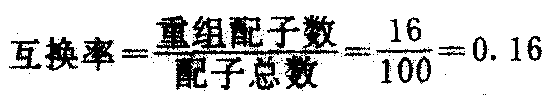 | 释义 | 互换率huhuanlu不完全连锁时(参见“不完全连锁”条),F1形成亲本型和重组型配子。所谓互换率,一般来说,是重组型配子数与总配子数(=重组型配子数+亲本型配子数)之比,因此又叫重组率。利用测交法较易计算互换率。因测交后代中的重组型个体数反映F1产生的重组型配子数,而测交后代的总个体数反映F1产生的总配子数。假定在F1雌蝇灰身长翅的测交后代中观察100个个体(参见“不完全连锁”条),其中亲本型占82个,重组型占16个,则