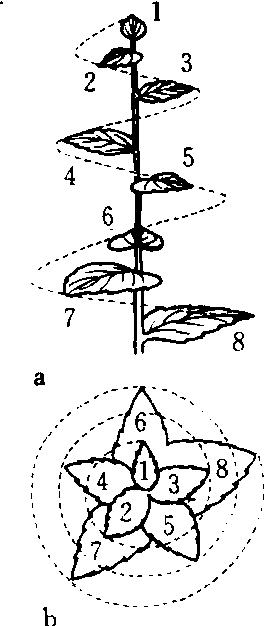 互生叶序(2/5)示意图 a.侧面观 b.顶面观 1~8.叶片 |