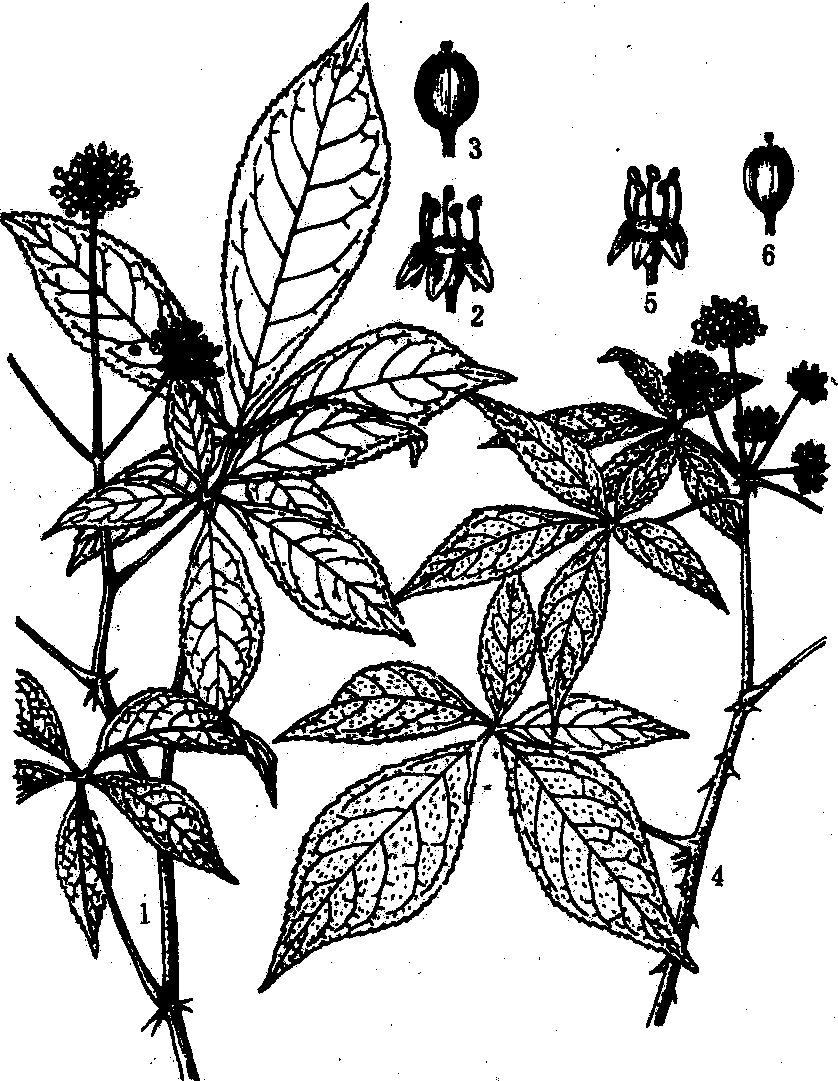 藤五加与刚毛五加 (1~3. 藤五加; 4~6. 刚毛五加) 乔木,灌木,木质藤本或多年生草本,常具星状毛,有时具粗的皮刺。叶常大型互生,罕对生或轮生,全缘或羽状和掌状裂,羽状或掌状复叶。气孔器多为平列型或不等细胞型,稀为无规则型。叶柄常宽大而呈鞘状,有时具明显托叶状附属物。多数为伞形花序,稀为总状、头状或穗状花序。花小,两性或杂性,有时单性异株。花萼小,5齿裂。花瓣5枚,稀10枚,常离生,稀基部合生,或合生成帽状脱落。雄蕊常与花瓣同数且互生,有时多数,花药纵裂。花粉三细胞型,常具3孔沟。子房下位,多数2~5心皮,子房室与心皮同数,花柱与心皮同数或合生,基部常膨大为花柱基。蜜腺盘位于子房顶部。胚珠每室1枚,倒生。胚乳核型。核果或浆果。染色体x=11,常为12。 药用植物较多,如人参(Panax ginseng)、三七(Panax pseudo-ginseng var. notoginseng)、五加(A-canthopanax gracilistylus),五加的根泡酒为五加皮酒。通脱木(Tetrapanax papyrifer)茎的白色髓部为药用通草。常春藤(Hedera nepalensis var.sinensis)常为庭园观赏植物,藤和叶也供药用。 五加科ginseng family;Araliaceae双子叶植物。乔木、灌木、木质藤本或多年生草本。常具星状毛,有时具粗的皮剌。叶常大型,互生,稀对生或轮生,全缘或羽状和掌状裂,羽状或掌状复叶,叶柄呈鞘状,有时具明显托叶状附属物。伞形花序,稀总状、头状或穗状花序。花小,两性或杂性,有时雌雄异株;花萼5齿裂;花瓣5,稀10枚,稀基部合生,或合生成帽状脱落;雄蕊常与花瓣同数且互生,有时多数,花粉粒常3孔沟;子房下位,2~5(多数)心皮,子房室与心皮同数,花柱基部常膨大为花柱基。每室胚珠1枚。核果或浆果。染色体x=11,常为12。本科约80属,900余种。广布热带、亚热带,少数分布温带。中国22属,160余种,几遍布全国,但主产西南部。药用植物较多,如人参、三七、五加、通脱木;常春藤〔Hedera nepalensis var. sinensis(Tobl.)Rehd.〕为庭园观赏植物;鹅掌柴〔Schefflera octophylla(Lour.)Harms〕是南方冬季的蜜源植物。 五加科双子叶植物。多年生草本,灌木至乔木,茎有时有刺;互生,稀对生或轮生;单叶或羽状复叶或掌状复叶;花小,两性或单性,辐射对称,常为伞形、头状或穗状、总状花序。花瓣5~10,分离或合生。本科植物很多是药用植物,也是园林观赏和用材树种。世界80属,900种,广布两半球的温带和热带地区。中国包括引进的共23属,160种,主要分布在西南各省。东北至华北有5属。人参属人参和西洋参是重要药材;刺人参属的东北刺人参,产于长白山,茎、根,有滋补、强壮、兴奋功效;八角金盘属小乔木或灌木,可供观赏,为淮河以南常绿树种;通脱木中国特产供观赏、药用;常春藤属5种,中国产2种,园林观赏;鹅掌柴属约400种,中国产38种,分布西南至东南亚热带和热带地区;五加属,约35种,产亚洲。中国产20种,多为药用植物,少数为用材树种;羽叶参属约20种,分布于东南亚、南美、大洋洲。中国产15种,茎、根皮药用,治风湿关节痛; |