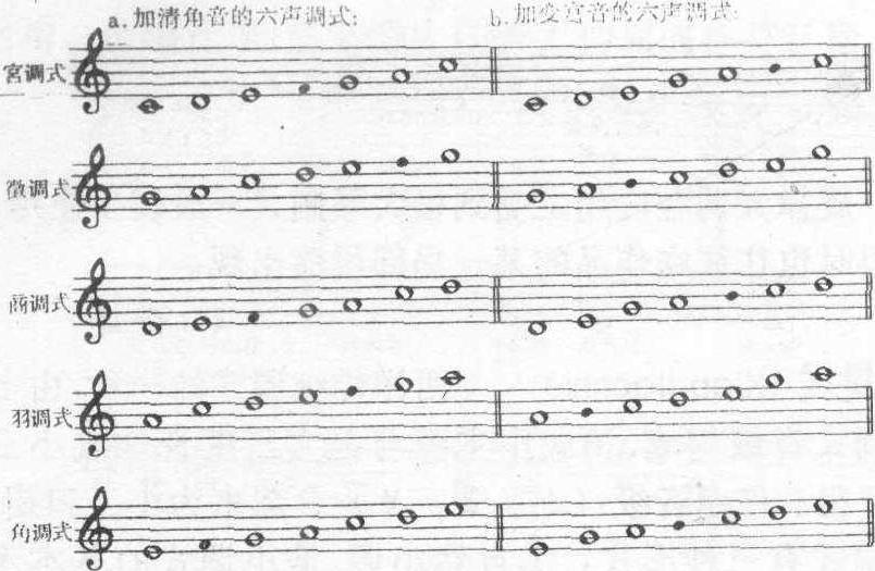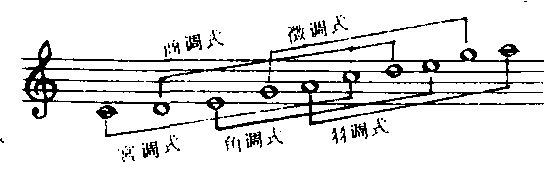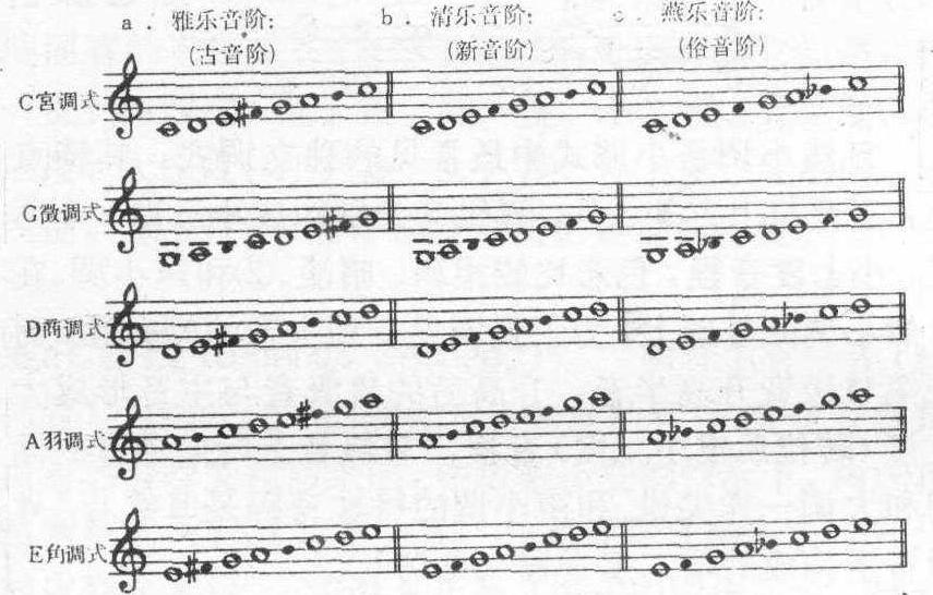 以上三类七声调式中,清乐音阶使用最广泛。雅乐音阶在我国一些地区的戏曲音乐中用得较多,燕乐音阶在我国西北地区的民歌和民间器乐曲中较常用。还需指出,变徵音、闰音,都不是临时变化音,而是调式内的音级,但在用五线谱记谱时,不将这两个偏音的升、降记号列入调号中,而作为临时变化音记谱。 |