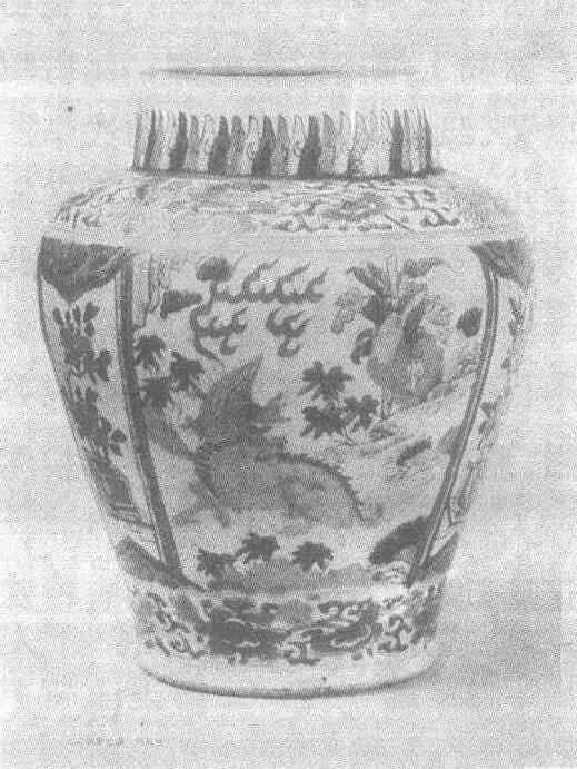 | 释义 | 五彩瑞兽纹瓷罐明万历。高30厘米。江西省景德镇陶瓷馆藏。五彩瓷在明代早期就有烧造,嘉靖、万历达到高峰。这时的五彩器使用釉上彩和釉下青花相结合的工艺,但青花已不占主要地位,而仅作为构成画面的一种色彩使用。之所以用青花做配色,是因为当时还未发明釉上蓝彩。此罐直颈,丰肩,腹下部内收,颈绘变形蕉叶纹。肩及颈各有一圈缠枝牡丹纹。腹部有四开光,内绘盆景、山石、瑞兽等图案。以红、绿、黄、褐及青花等多种色彩绘就的图案布满全器,呈现出姹紫嫣红的效果,是典型的万历瓷器绘画风格。