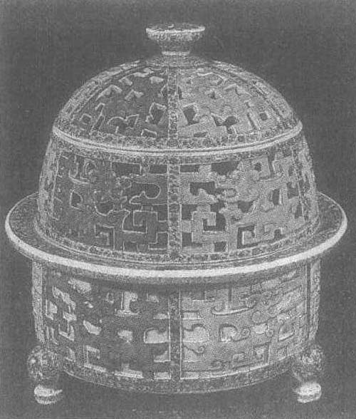 | 释义 | 五彩镂空瓷花薰清康熙。高24.6厘米,口径23.4厘米。台北故宫博物院藏。康熙时期的五彩瓷比前代有新的提高,最主要的突破是发明了釉上蓝彩,改变了明代釉上、釉下相结合的青花五彩器占主要地位的局面。此香薰由三层组成,三部分组合在一起后,器形上部显得浑圆,中部有凸起的平沿一周,下部外撇,底呈三个蹄形足。平顶钮上饰红龙戏珠。器身每层分六格,均以雕刻的夔龙为饰。雕刻手法为:第一、二层镂空,第三层剔地。每只夔龙以蓝、绿、白等色彩中的一种装饰。香薰的边栏绘五彩花卉。全器造型稳重端庄,纹饰繁复而有气派,是康熙时期五彩瓷器的精品。