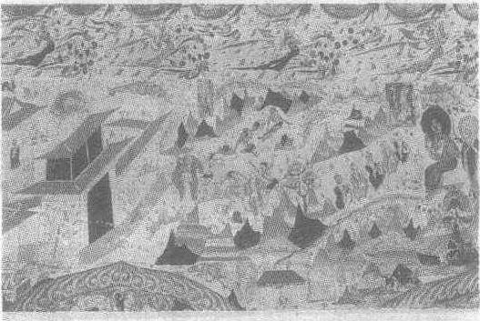 | 释义 | 五百强盗成佛图(放逐·得救)壁画 西魏。甘肃省敦煌县莫高窟第285窟南壁上层壁画。在山林旷野间战败被施以酷刑而流放的强盗,个个赤裸上身,披头散发,他们失去了双眼,痛苦万分,或跪、或站、或身体扭曲,似要高声呼喊,却又无处诉说。其形象写实,表情逼真。以一山相隔的下一个画面中,佛斜坐于宝座之上,脚踩莲花台,以香山药解救这些陷于绝境的罪人。身下的一排人单腿而跪,皆伸出右手仰视佛,其服饰整齐,表情虔诚的形象,表明已得拯救。四周是美丽的山野景色,鹿在悠闲漫步,鹅在水中畅游,山上一机敏的猎人在拉弓搭箭,准备射杀一只迎面跑来的黄羊。山间羊肥林茂,处处勃勃生机,烘托着佛的伟大和仁慈。图中的座座青山玲珑隽秀,色彩层次丰富,装饰性很强。