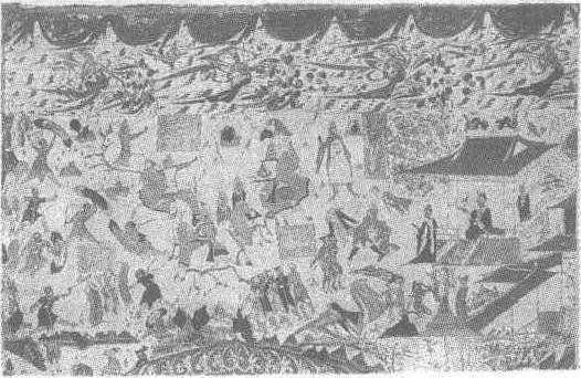 | 释义 | 五百强盗成佛图壁画西魏。纵140厘米,横628厘米。甘肃省敦煌县莫高窟第285窟南壁上层壁画。此图据《涅槃经》绘制。㤭萨罗国五百强盗作乱、致使王路断绝。国王波斯匿派大军征剿,五百强盗战败被俘,国王下令施以挖眼等酷刑,而后放逐山林。佛以神力吹香山药使强盗眼睛复明,并现身说法,使五百强盗皈依佛法,剃发出家,隐居山林,参禅入定,最后成佛。此图采用横卷式构图,自左至右画出交战、被俘、施刑、放逐、得救、听法、入山修行七个场面,似连环画般将故事的主要情节表现出来。画面结构紧凑,人物、战马、兵器等写实细腻,其他景色,如山、林等则富于装饰性,情景交融。作者以不同色彩赋于同一景物,使景物清晰而层次分明。整个画面色泽明快、醒目,为莫高窟西魏时期壁画的代表作。