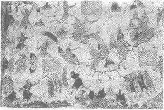 | 释义 | 五百强盗成佛图(作战)壁画西魏。甘肃省敦煌县莫高窟第285窟南壁上层壁画。此为强盗与官兵的作战场面。强盗穿裤褶、麻鞋、头束绢带,手持大刀、长矛、弓箭、盾牌。官兵们戴头牟,着裤褶、裆,持长矛、骑裹以铠甲的战马。装备精良的官兵气势颇大,人单力薄的强盗也毫不示弱,个个勇猛顽强。作者抓住了激战正酣的时刻予以充分表现,观者似能听到震天的杀声,兵器的撞击,战马的嘶鸣。图的右下角绘有一排双手反缚的被俘强盗,以此表示强盗终于战败的结局。这排俘虏并未垂头丧气或惊恐不安,而是一个个昂首挺胸,似有大义凛然之态,画面的衬景为浅黄色,其上以绿色赋彩为主,鲜艳而不失柔和。