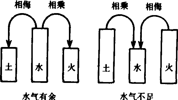 图3 五行相乘相侮示意图 五行学说在中兽医学中的应用 其应用可分为三类:一是根据五行的特性分析研究脏腑、经络等组织器官的五行属性;二是以五行的生克制化分析研究各脏腑经络之间和各生理功能之间的相互关系;三是以五行的相生和相克关系的异常阐述病理上的相互影响。 用于说明脏腑生理功能及其相互关系 五行学说将动物体内脏分别归属于五行,以五行的特性说明五脏的生理功能。在此基础上,以五脏配五行,五脏又联系着其本身所属的六腑、五官、五体等,从而把机体各部分和各种功能联结在一起,形成中兽医学以五脏为中心的生理病理系统,体现了动物体自身的整体性,并揭示动物体与外在环境之间相互联系的统一性。根据五行生克制化的规律,还可揭示机体肝、心、脾、肺、肾五个系统之间相互孳生、相互制约的关系,进一步确立动物是一个完整的有机整体的基本概念。如肾(水)之精以养肝,肝(木)藏血以济心,心(火)之阳以温脾,脾(土)化生水谷精微以充肺,肺(金)清肃下降以孽肾。这是以五行相生理论来解释五脏之间相互孳生、相互促进的关系。肺(金)清肃下降,可以抑制肝阳的上亢;肝(木)的条达,可以疏泄脾土的壅郁;脾(土)的运化,可以制止肾水的泛滥;肾(水)的滋润,可以防止心火的亢烈;心(火)的温煦,可以制约肺金清肃的太过。这是用五行相克理论来阐明五脏之间所存在的某些相互拮抗、相互制约的关系。 用于说明五脏病变的相互影响 五脏在生理上的相互联系,决定了在病理上的相互影响,因而脏与脏之间的病变可互相传变(即相互影响)。以五行学说来说明五脏病变的传变, 包括相生关系传变和相克关系传变两类。 相生关系的传变 就是病变顺着或逆着木、火、土、金、水次序的传变。可归纳为母病及子和子病犯母两种类型。母病及子,是指疾病顺相生次序的传变,由母脏发展到子脏。如脾有病后传于肺, 脾属土, 肺属金, 脾为母, 肺为子, 由于脾土虚, 殃及肺, 故为母病及子。例如, 牛马因劳役过度, 喂饮失时, 日久脾土虚弱, 不能生肺气,而形成脾肺两虚证。“伤力脾虚”,即属这种情况。子病犯母又称子盗母气, 如心有病后传于肝, 心属火, 肝属木, 木为母, 火为子, 由于火太过将病变传于木, 故为子病犯母。例如马牛在暑热炎天, 负重过度, 奔走太急, 热积于心, 心传于肝, 肝传于目, 而发生外障眼, 即属此种情况。 相克关系的传变 就是病变顺着或逆着脏腑相克次序的传变, 也叫“相乘”为病和“相侮”为病。二者均系相克的异常, 都属病理状态。相乘为病, 即相克太过为病, 指的是顺相克次序的制约为病。其原因有两个: 一是克制的一方过盛, 以强凌弱, 使被克的一方受到过分抑制; 二是被克的一方虚弱, 不能抵御对方的克伐,而表现出的病理状态。以肝和脾的关系而言,前者是肝强乘脾, 常表现为肝气横逆犯脾、犯胃等实证性病变; 后者则为脾虚肝乘, 常表现为肝脾不和等虚证性病变。 相侮为病即反克为病, 故又称“反侮”, 指的是逆相克次序的制约为病。其原因有两个: 一是由于一方太盛, 不仅不受克己一方的抑制, 反而进行反克; 二是由于一方的虚弱, 无力克制对方, 反被抑制而发生病变。以肺肝的关系而言, 肺属金, 肝属木, 肺的肃降本应制约肝气、肝火的升动, 防其太过, 但如肺虚或肝旺, 又可导致肝气、肝火犯肺等一系列病变。 用于指导诊断 动物是一个有机整体, 内脏有病可以通过各种途径反映到体表的相应组织器官, 表现出形态、脉象、口色、声音等的异常变化。由于五脏与五色、五音、五味等都可归类于五行, 而五行中同一行的事物之间有着相互感应现象,存在着某些联系,因此五行学说可以指导疾病的诊断。临证上往往通过综合望、闻、问、切四诊所得的材料, 根据五行的归属及其生克乘侮理论, 来推断病情。所以, 在诊断动物疾病的过程中, 不但要详细观察病状, 抓住特有的体征, 而且还要应用五行学说来分析疾病的发展和传变过程。 通过应用五行学说, 一方面可以说明疾病传变的过程及其相互之间的关系, 另一方面还可初步判定其预后。一般说按相生传变, 预后为顺, 病较轻; 按相克传变,特别是按反侮方向传变, 预后为逆, 病较重。如《司牧安骥集》指出:“肝病传与南方火, 父母见子必相生; 心属南方丙丁火, 心病传脾祸未生; 脾家得病传与肺, 安荣必定土生金; 肺家得病传于肾, 金水相和无退迎; 肾家得病传于肝,水能生木必相亲;……肝家有病传于脾,木来克土必灾生; 脾家有病传于肾,土来堰水疗无因;肾家有病传于心,水来浇火救无门; 心家有病传于肺,金逢火化倒销形; 肺家有病传于肝,金能克木病难痊。”这些在诊断上均有一定的参考意义。 用于指导治疗 控制疾病的传变 指治疗疾病时, 除应对病脏进行处理外, 还须在生克乘侮理论指导下, 调整各脏之间的相互关系, 防止疾病传变, 并促进病脏恢复。但疾病的传变错综复杂, 治疗时须根据病证的具体情况灵活掌握,不可把五行的生克乘侮当作死板的公式,机械地套用。 确定治疗原则和方法 ❶根据相生规律确定治疗原则:基本原则是“补母”、“泻子”。补母, 指“虚则补其母”,主要用于母子两脏皆虚或子脏虚弱之证, 通过补母能使子虚症状得到改善。如肝肾阴虚, 肾阴不能滋养肝木, 称为水不涵木,治疗可以补肾阴之虚为主,借肾阴以滋养肝木。又