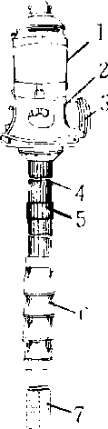 深井泵 1. 电动机 2. 泵座 3. 出水法兰盘 4. 输水管 5. 联管器 6. 泵体 7. 滤水管 |