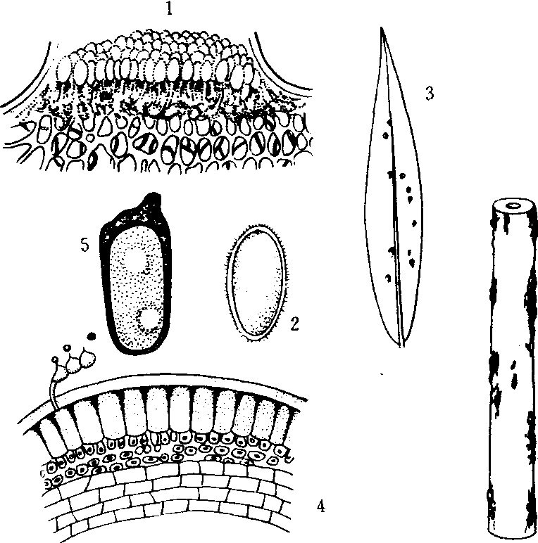 亚麻锈菌 1.夏孢子堆; 2.夏孢子(放大); 3.亚麻叶上夏孢子堆;4.冬孢子堆及萌发的担孢子; 5.冬孢子(放大); 6.亚麻茎上冬孢子堆 侵染过程和病害循环 病菌以冬孢子在土中的病残体上或混种子中的病组织碎片中越冬,翌年春季萌发产生担子及担孢子,以担孢子侵染幼苗的茎叶,以后形成性子器,再产生锈子腔及锈孢子。锈孢子借风雨传播侵染茎、叶、花序、小枝及萼片。后形成夏孢子堆,夏孢子藉风传播并从气孔侵入,进行重复侵染。夏孢子对病害的传播作用最大。生长后期形成冬孢子。 病害防治 种植抗病品种是控制该病的最有效措施,目前中国推广的黑亚5号和6号属高抗品种,流行年份仍可保产。严格执行检疫制度,严防新小种传入。实行轮作,或收麻后清除病残,同时选无病地留种,减少初侵菌源。加强培管,包括适时早播,避免施过多氮肥,增施钾肥,开沟排水,均可减轻发病。发病初期喷布萎锈灵或敌锈钠。 亚麻锈病flax rust亚麻的重要真菌病害。病原菌是担子菌亚门的亚麻栅锈菌〔Melampsora lini (Ehrenb) Lév.〕。叶、茎、花梗及蒴果均可危害。春季在被害叶片和茎秆上产生黄色小点(病菌的性子器和锈子腔),后在叶、茎和塑果上产生红黄色夏孢子堆,成熟期,在叶、茎和蒴果表皮下产生黑色有光泽的冬孢子堆。冬孢子堆不突破表皮。病菌以冬孢子在病残体上或种子表面越冬,田间以夏孢子借风雨传播进行再侵染。冬孢子经-20~-30℃低温刺激后才能萌发,产生担子及担孢子侵染麻苗。多雨高湿天气有利于发病,种植过密发病重。选用抗病品种、轮作、加强田间管理和喷洒药剂可减轻危害。 |