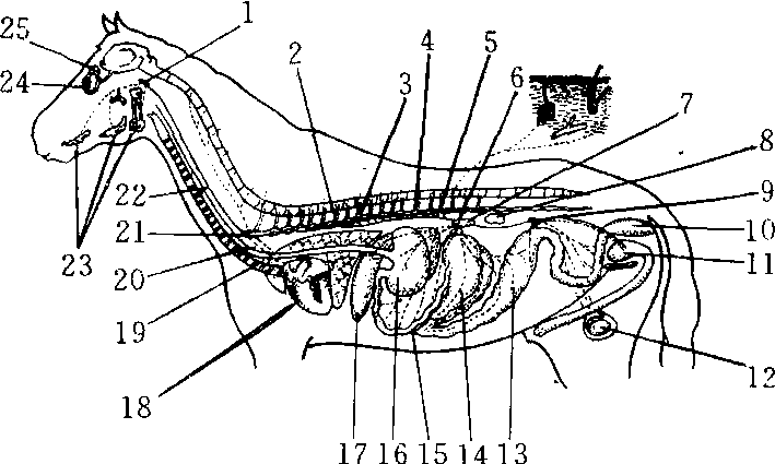 马的交感神经分布 (实线示节前神经纤维,虚线示节后神经纤维) 1.颈前神经节 2. 白交通支 3. 灰交通支 4. 交感神经干 5. 内脏大神经 6. 内脏小神经 7.腹腔肠系膜前神经节 8. 肾 9. 肠系膜后神经节 10. 直肠 11. 膀胱 12. 睾丸 13. 大结肠 14. 盲肠 15. 小肠 16. 胃 17. 肝 18. 心 19. 气管 20. 食管 21. 星状神经节 22. 颈部交感干 23. 唾液腺 24. 眼球 25. 泪腺 |