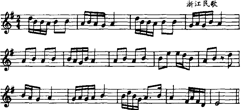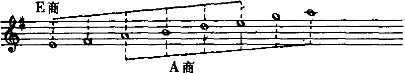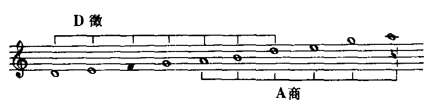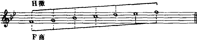 ❷同主音交替:构成交替的两个调的主音相同,但调式音列不同,所以调式不同。经常遇到的有C徵与C商、A羽与A商、G宫与G徵等在大小调体系中,同主音大小调的交替,也属于这一类。如山西民歌《茶山情歌》: