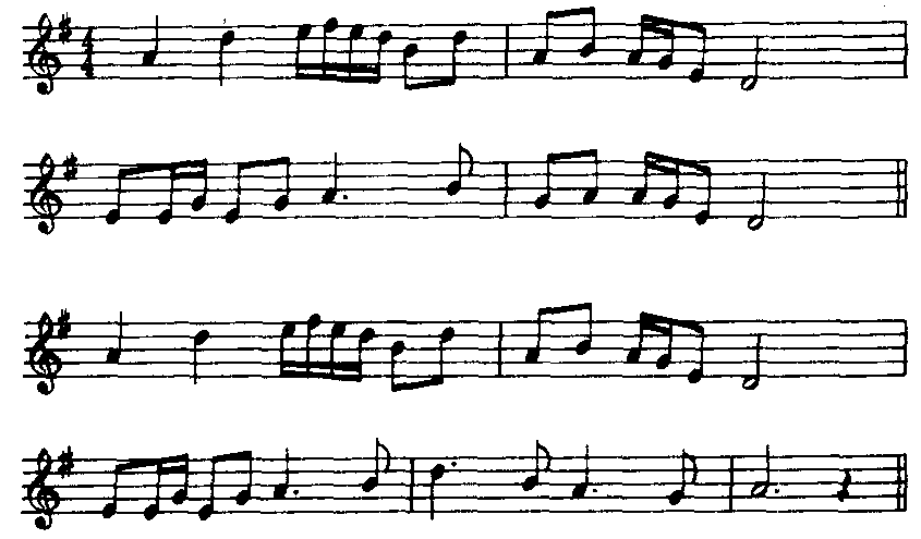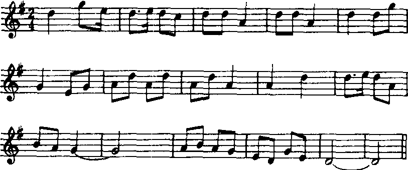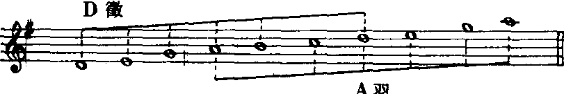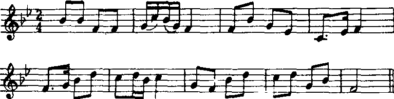 ❸不同主音不同音列的交替:此类交替调式不及以上两种普遍及典型,因为两个交替调式的主音、音列完全不同,而调式也不完全相同,如C宫与G宫、D徵与A羽等调式的交替,如下例:内蒙民歌《满野歌声满野笑》