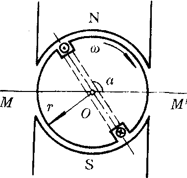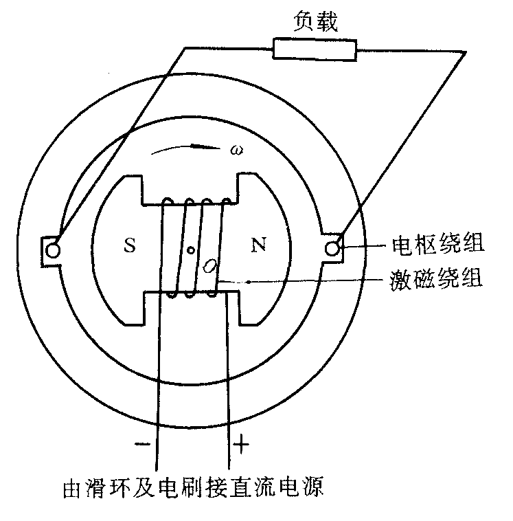 图 1 它主要由转子、定子两部分构成。图中甲是由原动机(汽轮机或水轮机等)带动转动的部分,称为转子。转子中小圆圈部分是线圈导线截面,这个线圈的作用是切割磁感应线产生感应电动势。该线圈又称电枢绕组,它与铁心合在一起称为电枢。电枢转动时,电枢绕组的两个引出线端通过滑环、电刷与外电路相接。图中乙是发电机的不动部分称为定子。它是绕有多匝线圈的电磁铁,其中的线圈称为激磁绕组,激磁绕组与外部的直流电源相接。由于图1中发电机的转动部分是电枢,所以这种发电机称为旋转电枢式发电机。发电机定、转子之间的空气缝隙简称气隙。气隙中的磁感应强度既垂直于定子铁心表面又垂直于转子铁心表面。设计使气隙中B的大小沿气隙圆周正弦分布,表述为B=Bmsinα,式中α角是线圈平面与中性面MM′的夹角,如图2所示。 ![]() 图2 当转子以匀角速ω(v=ωr,r是转子的半径)转动时,每匝线圈有两个边切割磁感应线,所以1匝(每一圈叫一匝)线圈产生的感应电动势为e1=2vBl=2vBmlsinα。式中l为线圈在磁场中的边长;若t=0时线圈平面与中性面夹角为ᵠe,则a=ωt+ᵠe)。e1=2vBmlsin(ωt+ᵠe)。当线圈绕组为N匝时,则发电机的总电动势为e=Ne1=2NvBmlsin(ωt+ᵠe),令εm=2NvBml,e=εmsin(ωt+ᵠe)。 可见发电机的电动势是随时间作正弦变化的。 交流发电机是把机械能变成电能的装置。在能量转换过程中安培力起着重要作用。由安培定律可知,载流导线在磁场中要受到安培力。安培力对电枢绕组提供的是电磁阻力矩。当外电路不带负载时(外电路开路),电枢绕组中没有电流,此时电枢绕组不受安培力。为了维持电枢匀角速ω转动,外力矩只需等于摩擦阻力矩,外力矩的功全部转化为摩擦所生的热量,这种情况称为空载运行。当发电机带负载(外电路接通)后,则有电流通过电枢绕组,它将受到安培力的电磁阻力矩,这时为保持电枢绕组仍以匀角速ω转动,外力矩必须等于摩擦阻力矩与电磁阻力矩之和。外力矩的功除变为摩擦所生热的部分外将全部转变为负载所消耗的电能。可见在能量转化过程中安培力起了关键作用。一般对发电机提供外力矩的装置主要有汽轮机、水轮机等,相应地就有火力发电及水力发电等形式。近代发电机为了有强大的功率输出,电枢绕组的电压高达几千伏乃至上万伏,电流达几千安培。为了避免由于高电压、大电流在滑环与电刷间造成的严重火花,功率在几十千瓦以上的发电机一般都把电枢和电磁铁互换位置,让电枢固定而磁极旋转,如图3所示。这样改造后电枢绕组就可以直接与负载相接,而让电压和电流都较小的电磁铁的激磁绕组通过滑环、电刷与外部直流电源相接。这样的发电机称为旋转磁极式发电机。现代发电厂中的发电机一般都是这种发电机。
