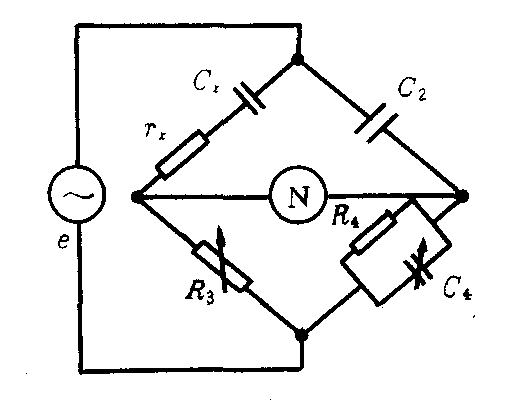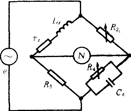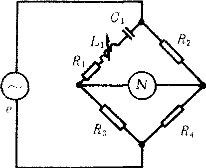 图1 常用的交流电桥有电容电桥、麦克斯韦LC电桥、频率电桥等。电容电桥用于测量电容和绝缘材料性能。如图2示,电容电桥平衡时,有rx=R3C4/C2,Cx=C2R4/R3。麦克斯韦LC电桥,如图3示,电桥平衡时有rx=R2R3/R4,Lx=C4R2R3。因而可测自感Lx,由Q值的定义还可测得Q=ωLx/rx=ωC4R4。频率电桥,见图4。调节C1或L1,使Z1支路处于谐振状态,这时四臂呈纯电阻,其平衡条件与直流电桥相同。所以电桥平衡时,ωL1-1/ωC1=0R1/R2=R3/R4,因而ω=1/ ![]()