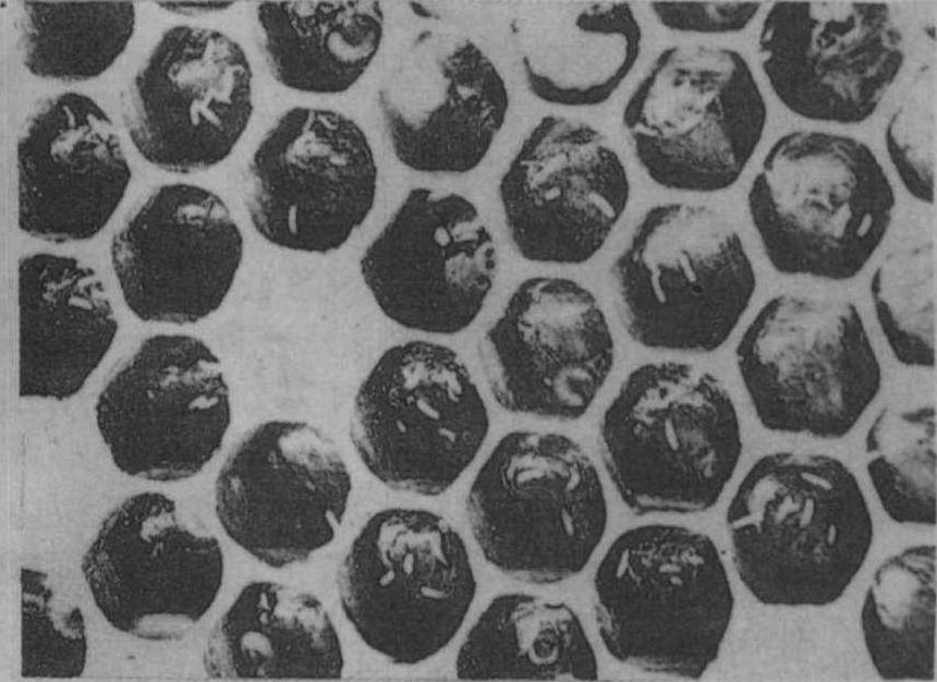 产卵工蜂所产的卵(一个巢房内有数粒卵) 产卵工蜂除产未受精卵外,其生物学特性与正常工蜂表现基本相同,它们也参加巢内一切活动,例如食花粉和蜂蜜、出巢采集等。有产卵工蜂的无王群里,与工蜂日龄有关的各项活动也和正常蜂群一样,但存在较老龄的工蜂既参加采集又参加育虫的现象。蜂群的造脾能力有所降低。在这样的蜂群里,工蜂常将采集的花粉和花蜜贮存在幼虫区下面,而不像正常蜂群那样将花粉和花蜜贮存在幼虫区上面。如果诱入一只真蜂王,贮存方式就会很快恢复正常。在有产卵工蜂的无王群中,哺育蜂不能辨别幼虫性别,常误将雄蜂幼虫当作工蜂幼虫饲喂;对待产卵工蜂的“态度”也不像对蜂王一样;特别是当工蜂发现在工蜂房里育出的是雄蜂时,常追逐攻击产卵工蜂。在无王群中,有时会出现假蜂王,也有工蜂围绕侍卫,其外表与正常工蜂相似,只是腹部略为伸长且发亮。出现产卵工蜂的蜂群,其采集能力明显下降,产蜜量减少,对养蜂生产损失很大。因此,对失王的蜂群应及时诱入蜂王,使蜂群恢复正常。对于失王过久,群势小,诱入蜂王又很困难的工蜂产卵蜂群,可将其分成几部分,分别并入其他蜂群。 中蜂群失王后,较易发生工蜂产卵。发现蜂群失去蜂王时,可立即诱入成熟王台或产卵蜂王。如果诱入蜂王不被接受,应将工蜂产卵群移开原位。原位上另放一个蜂箱,内放一框有蜂王和蜜蜂的子脾,使工蜂产卵群的蜜蜂飞回时进入。入夜再将工蜂产卵群内所有巢脾提出,把蜂抖落在箱内,翌日它们自动飞回原址,然后将放在原位的蜂箱加脾调整。 产卵工蜂laying workers产未受精卵的工蜂。出现于无王群(见“无王群”)中。如蜂群无王时间较久,可引起部分工蜂的卵巢发育产卵,成为产卵工蜂。由于工蜂的雌性生殖器官已明显退化,失去与雄蜂交配的机能,所以产卵工蜂所产的卵都是未受精卵,一般只能发育成雄蜂。产卵工蜂的数量不定,有的可达工蜂总数的25%以上。产卵工蜂除腹部略微伸长外,其他形态与正常工蜂无明显区别,而且照样参加巢内一切活动,并出巢飞行,也食用蜂蜜、花粉。给这种无王群诱入蜂王或将它与正常的蜂群合并之后,工蜂产卵现象就会消失。此外,在有分蜂迹象的蜂群和蜂王不良的蜂群中,存在一些卵巢已经发育但又不产卵的工蜂,称为“解剖学上的产卵工蜂”。 |