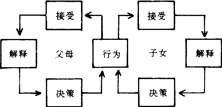 | 释义 | 亲子互动即父母与子女交往中的相互影响过程。以往人们在研究亲子之间的交往时,比较强调父母一方的主动性,仅将子女视为父母影响的被动接受者。近年来的深入研究表明,子女,即使是刚出生不久的婴儿,也是亲子交往中的积极支持者、维护者,甚至是发动者。比如,不足一个月的婴儿已能对父母的微笑、抚摸和语言作出明显的反应,他们会注视父母的眼睛,对之微笑,喃喃作声并且“手舞足蹈”。孩子的这种行为无疑会进一步唤起父母的怜爱之心,促使他们继续与孩子交往。根据这种情况,可以绘制出亲子互动行为模式图如下:如图4.1-3所示,亲子交往中,任何一方的行为(包括语言、表情、动作等)都会引起另一方的注意(接受)。然后,接受者根据自己对这种行为的理解(解释)作出如何反应的决定(决策),并付之于行动(行为),而这一行为又为对方所接受,引起一系列反应活动……。由此可见,亲子之间是一种双向的相互影响的关系:一方面,父母对子女的态度和教养行为会影响子女对父母的情感态度,会影响子女的行为和发展;另一方面,子女的行为又会影响父母的态度和教养行为。 图4.1-3 亲子互动行为模式图 |